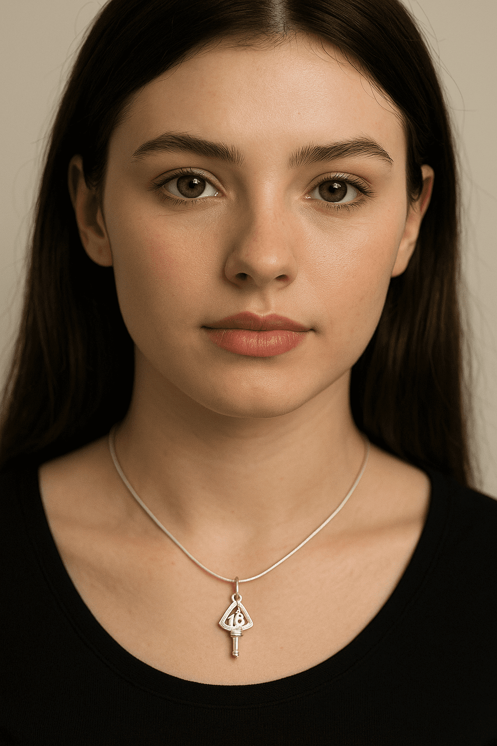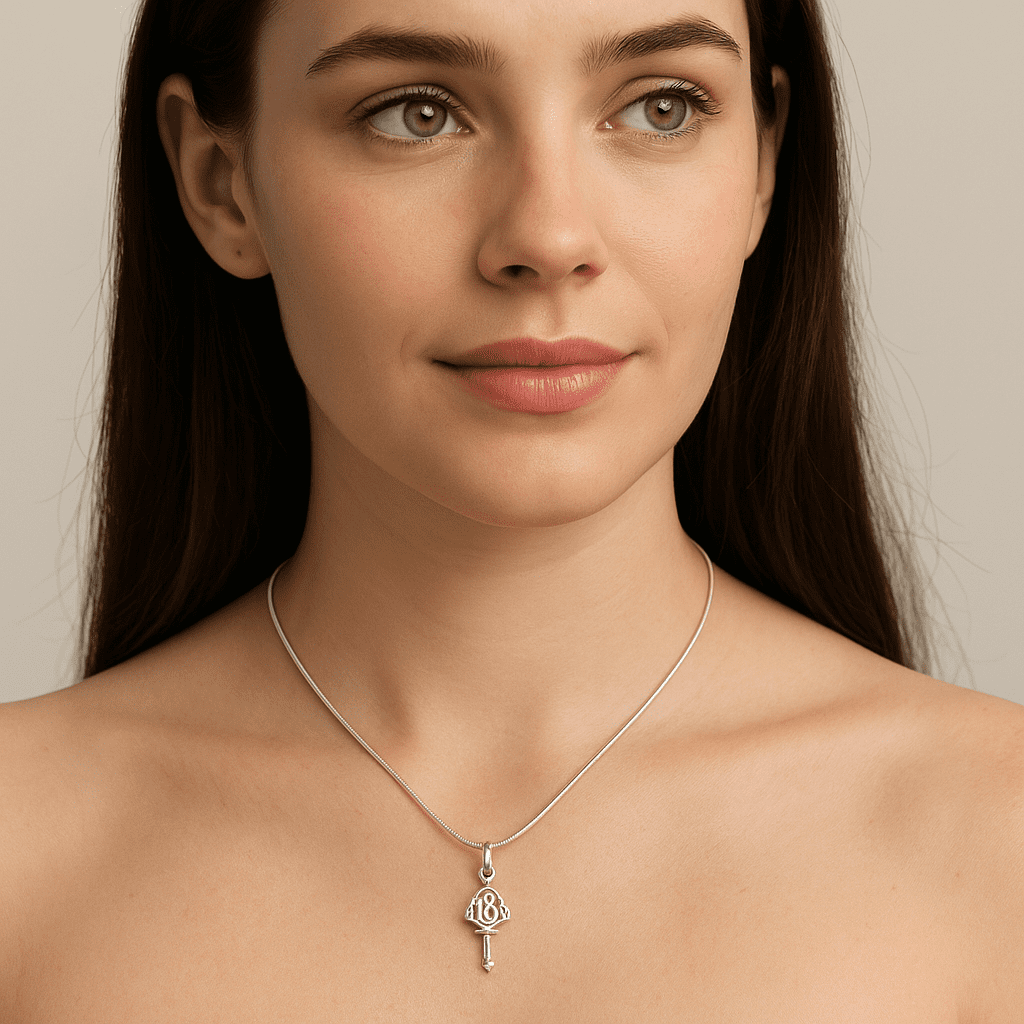 Suspended from a 14.5-inch sterling silver rope chain, the intricately designed pendant features the number 18 worked into a decorative key motif. Traditionally, the “Key of Life” is given at 18 to symbolise adulthood, independence, and the opening of new opportunities.