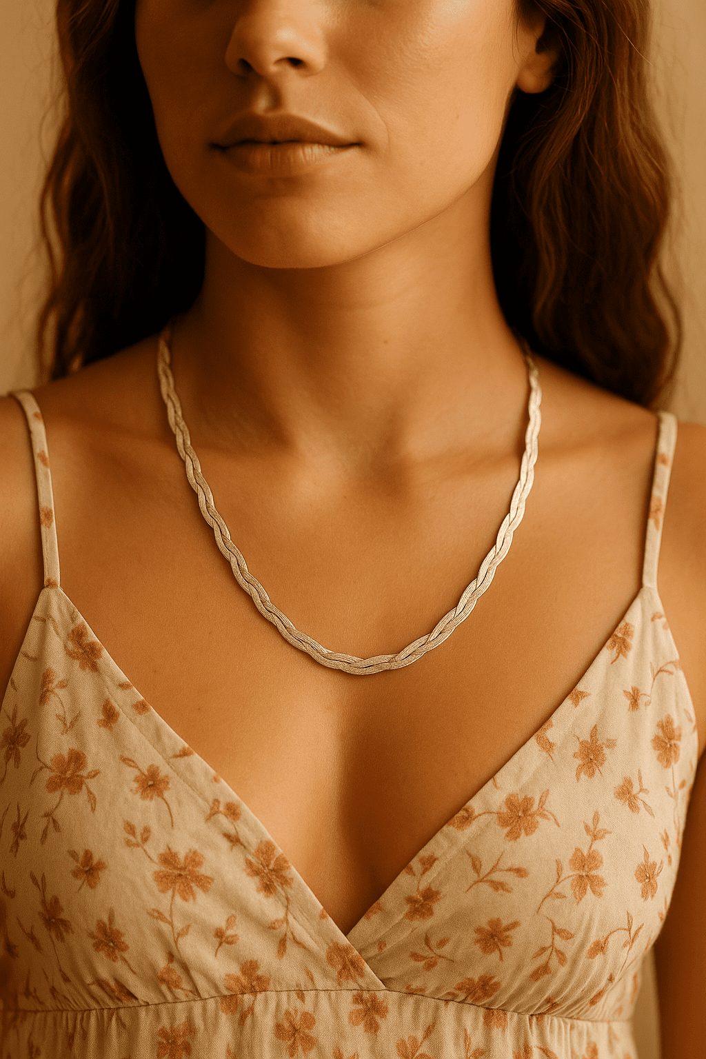 This elegant piece showcases three interlaced strands of solid 925 sterling silver, masterfully woven into a braided, flexible chain that reflects light from every angle. Its texture gives it an unmistakable luxury feel — smooth, sculptural, and visually fluid around the neckline.