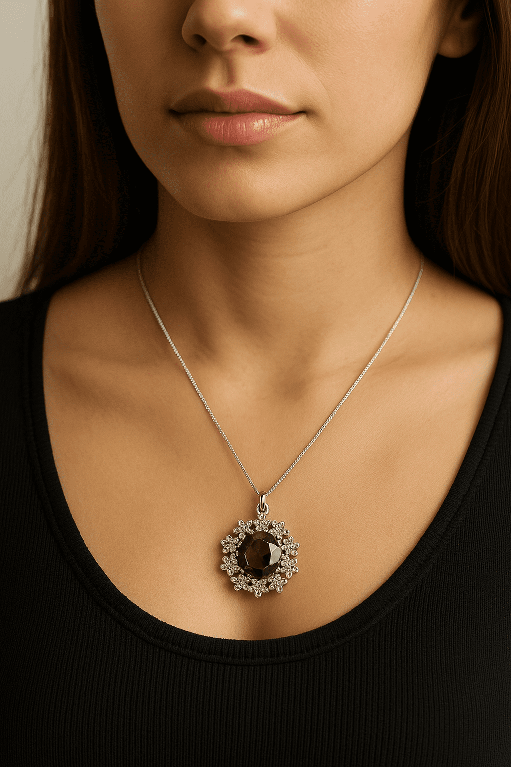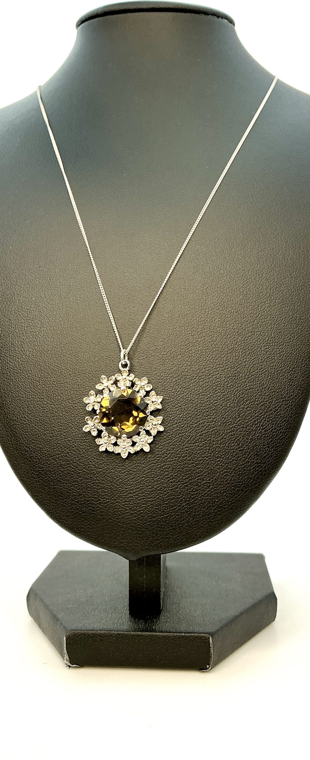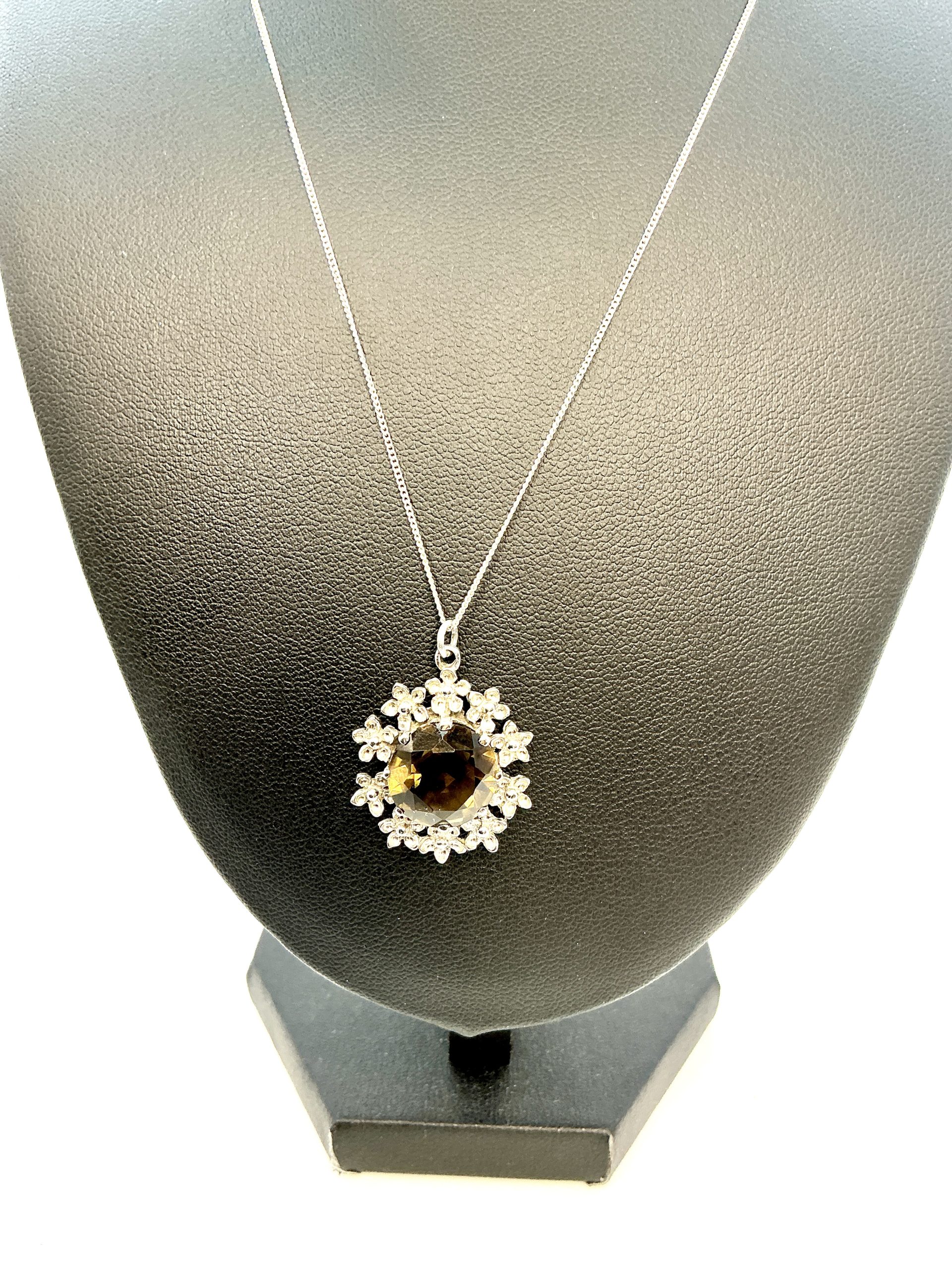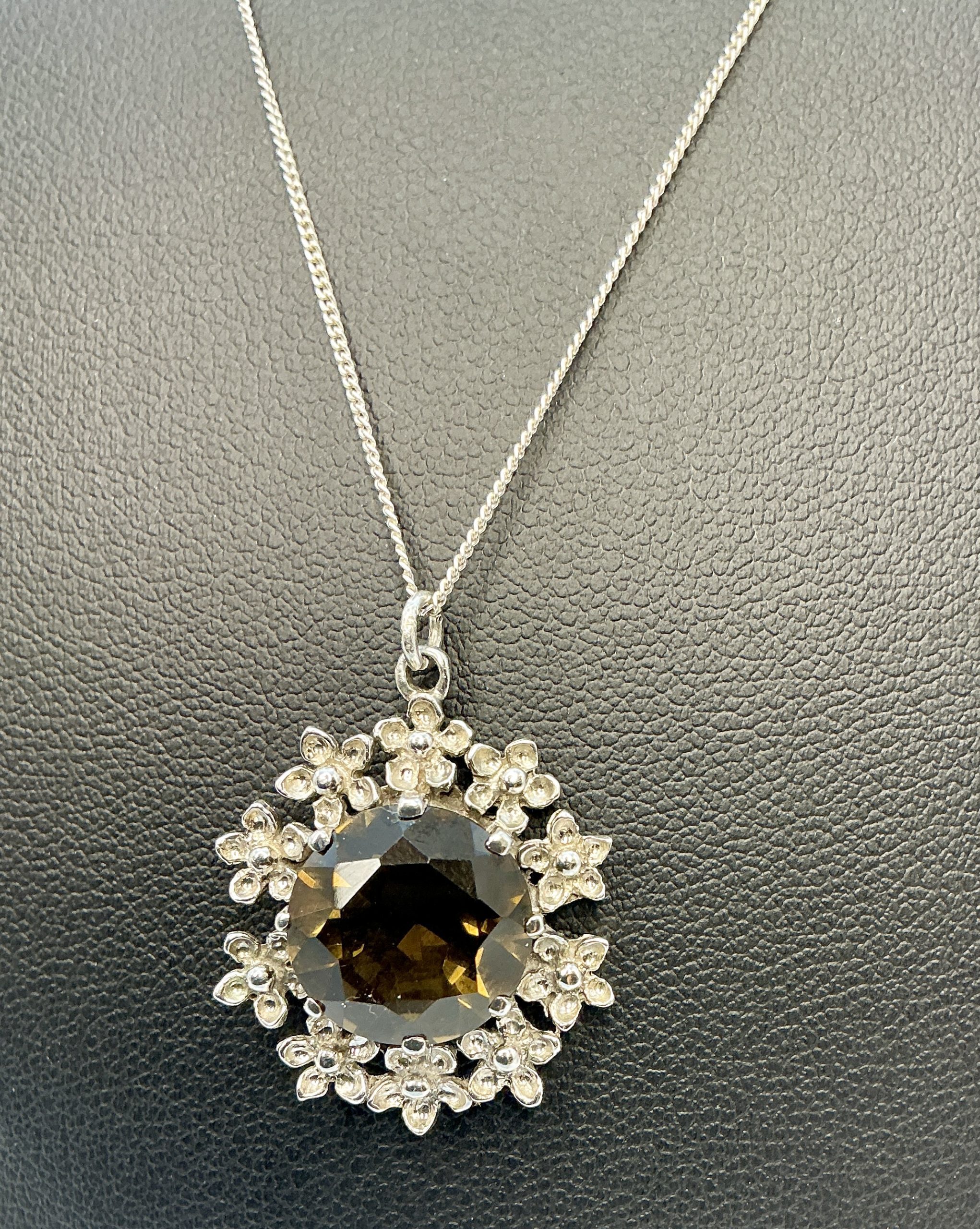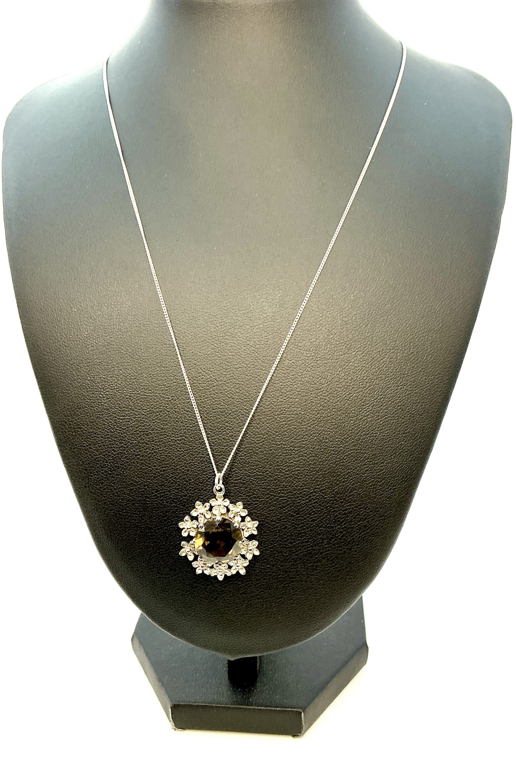 This 925 sterling silver tourmaline pendant necklace is a striking piece of gemstone jewellery, perfect for collectors and lovers of fine silver. The pendant features a brilliantly faceted tourmaline gemstone, its deep earthy tones beautifully offset by an ornate floral silver setting.