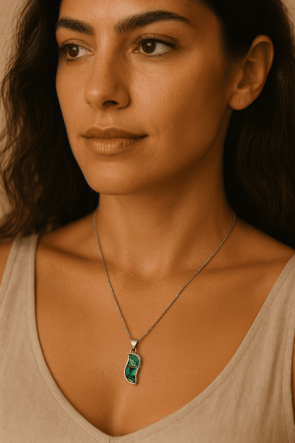The pendant showcases a natural abalone shell set in solid sterling silver, displaying the sea’s vibrant colours — from deep turquoise to pearly green and soft violet. Each shell’s natural pattern ensures that no two pendants are ever alike.