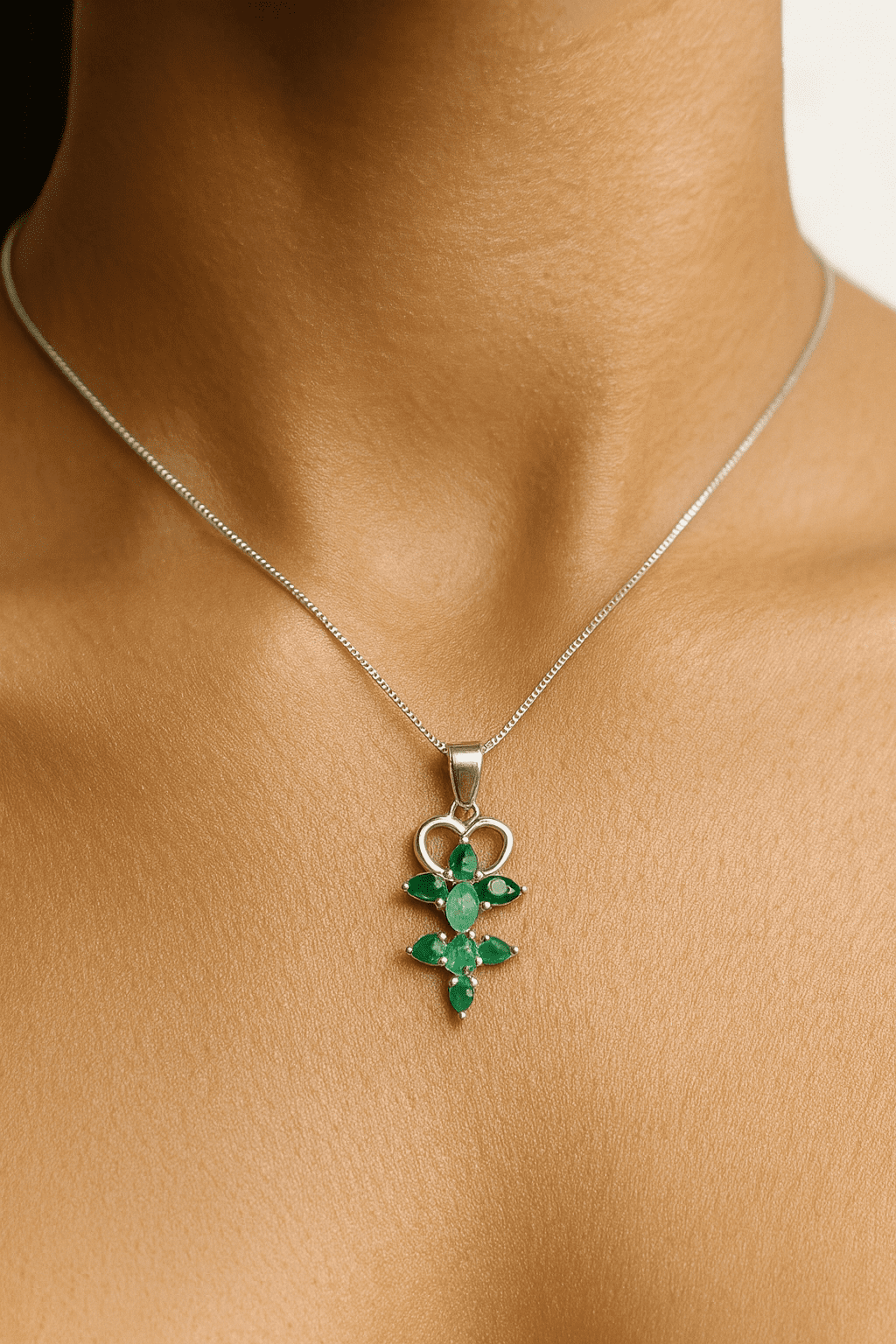 The pendant showcases marquise-cut and round-cut emerald-coloured stones, arranged in a delicate floral pattern that radiates luxury and refinement. The vibrant green hue evokes the richness of natural emeralds, symbolising renewal, love, and prosperity.