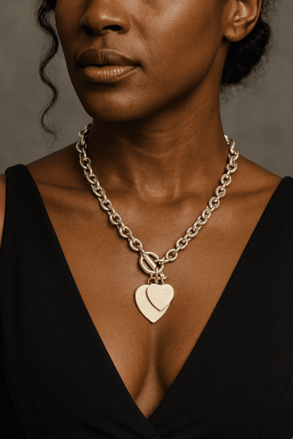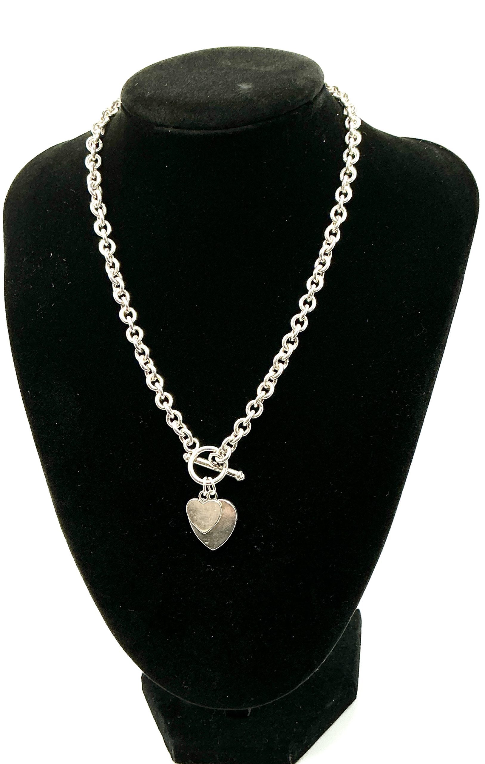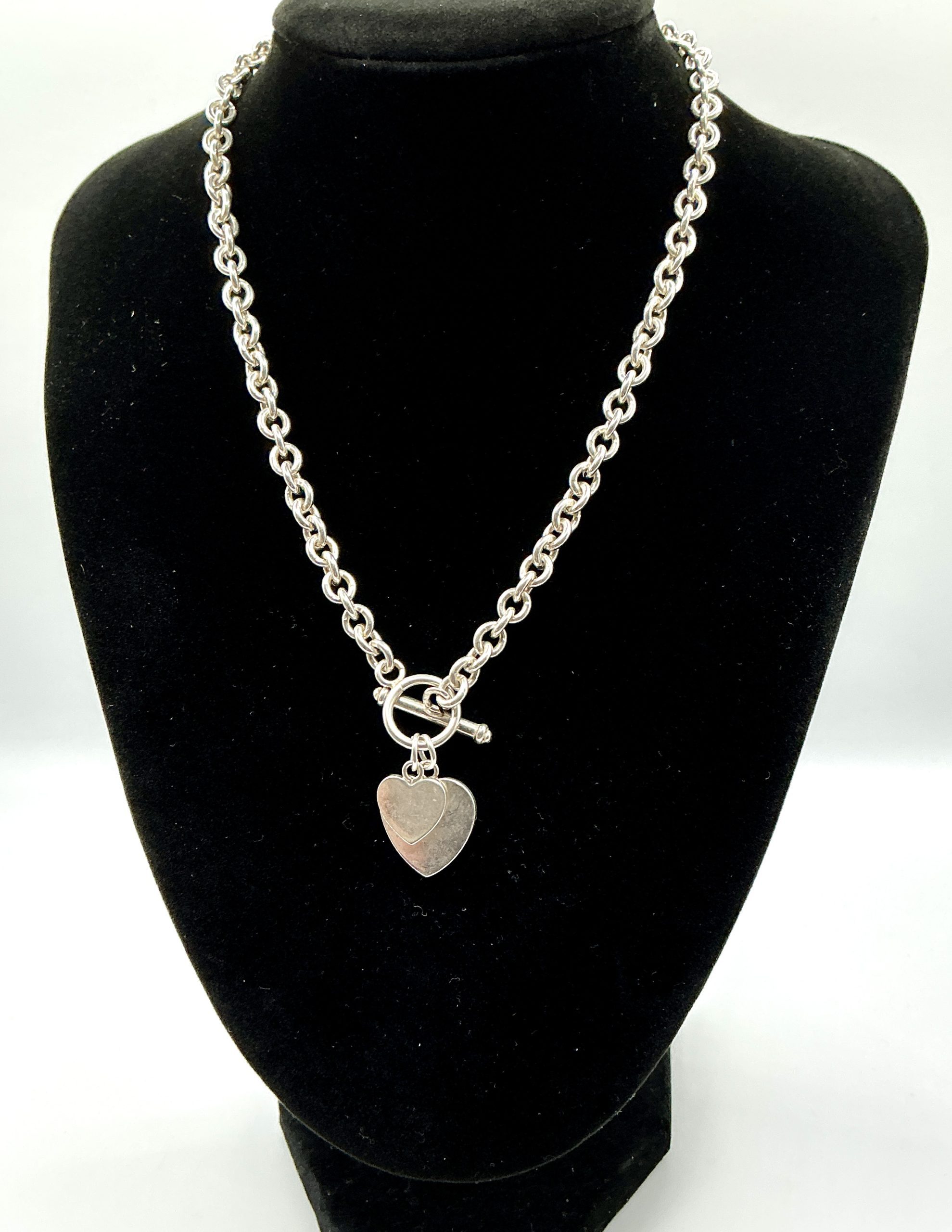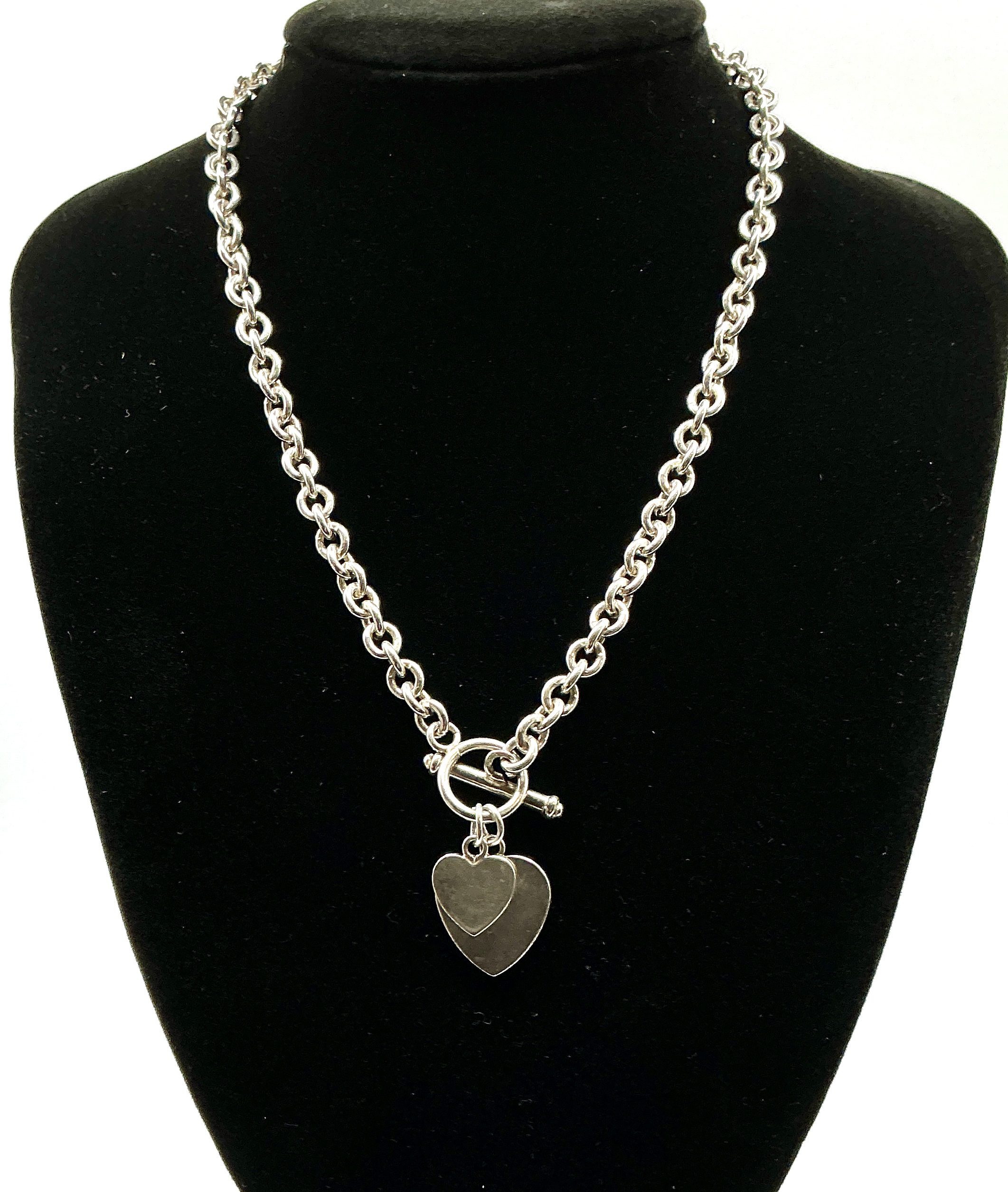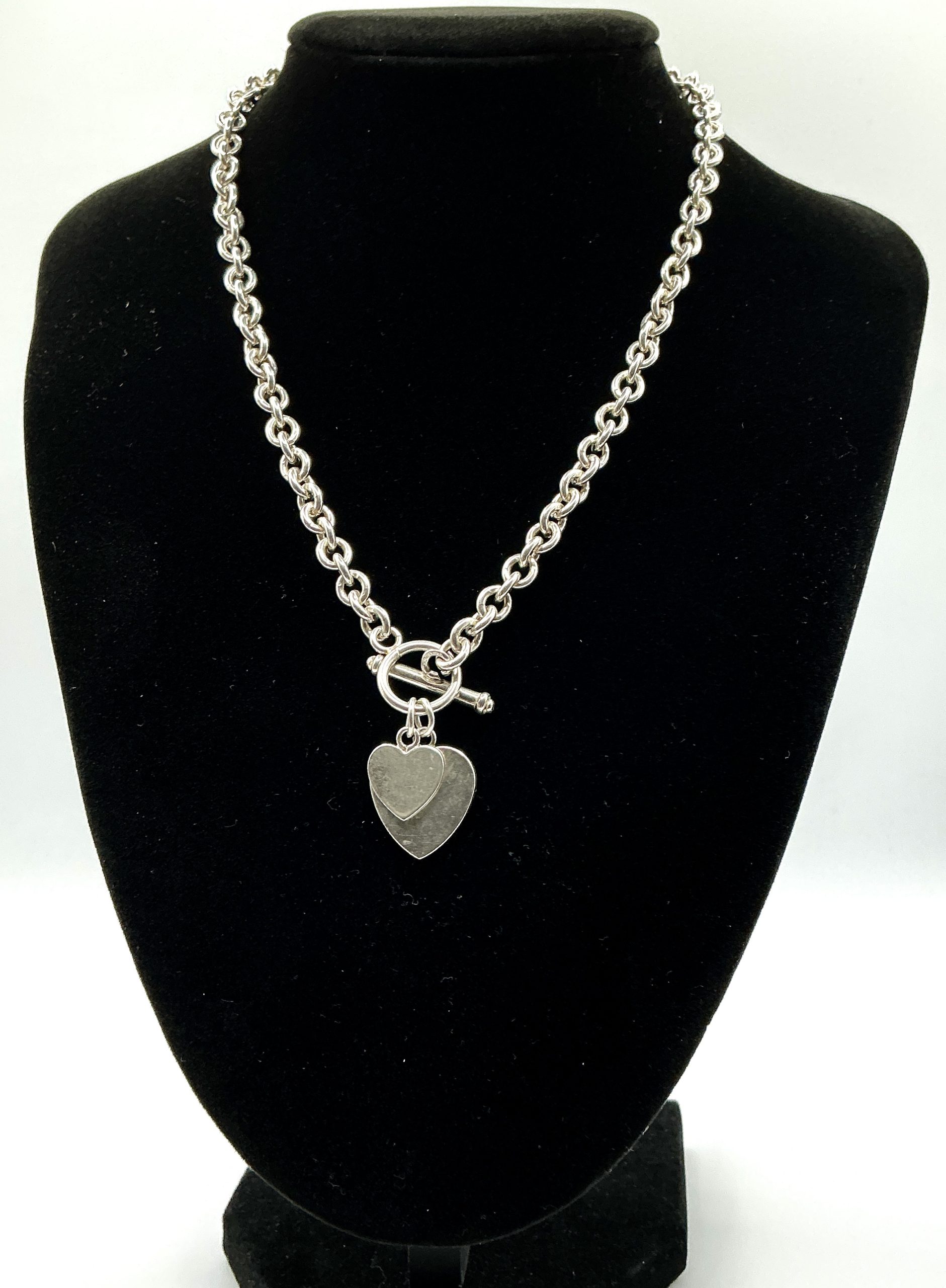 37g 925 Sterling Silver Chunky Link Necklace with Double Heart Pendant & T-Bar Clasp – 18” – Timeless Luxury