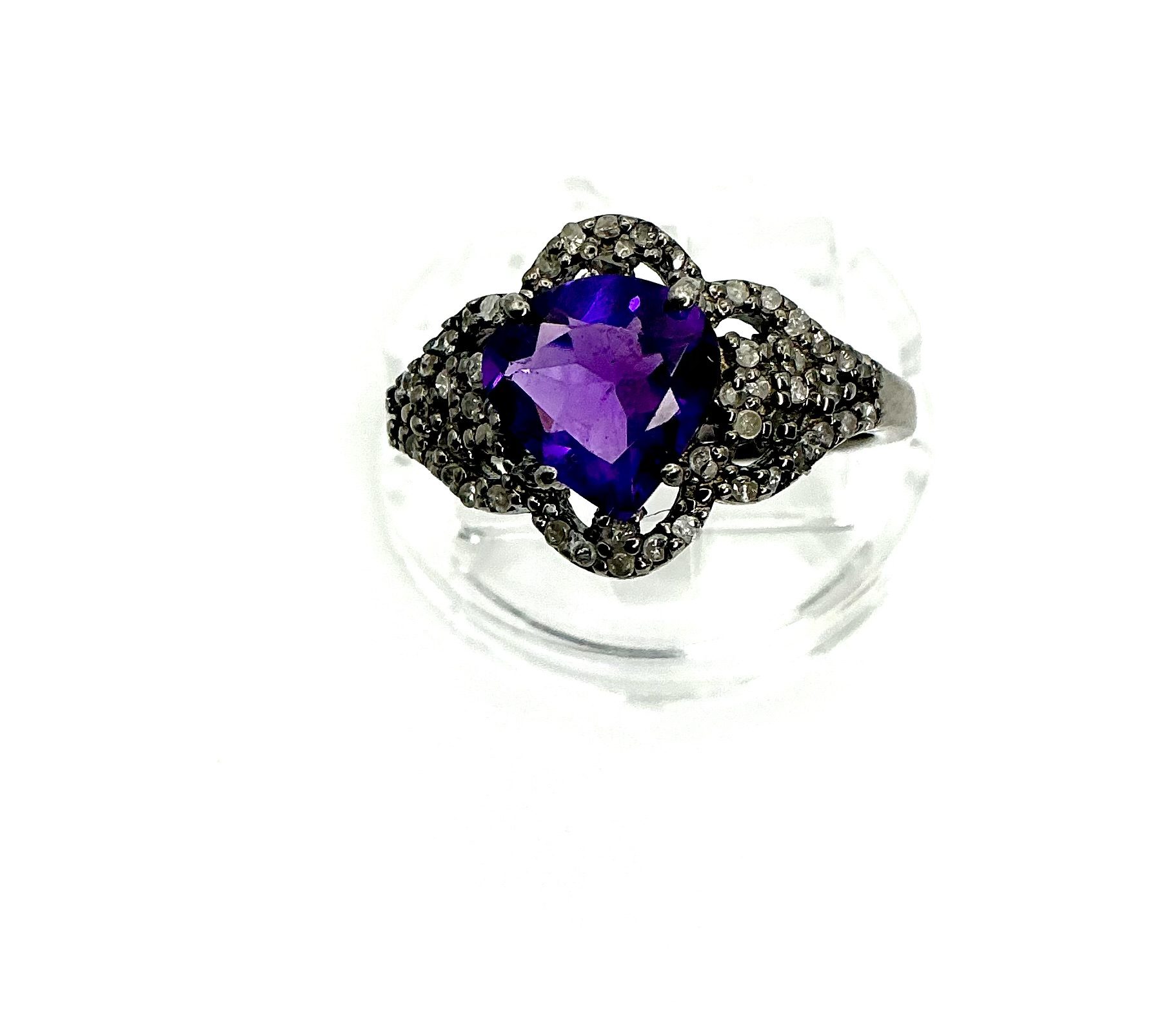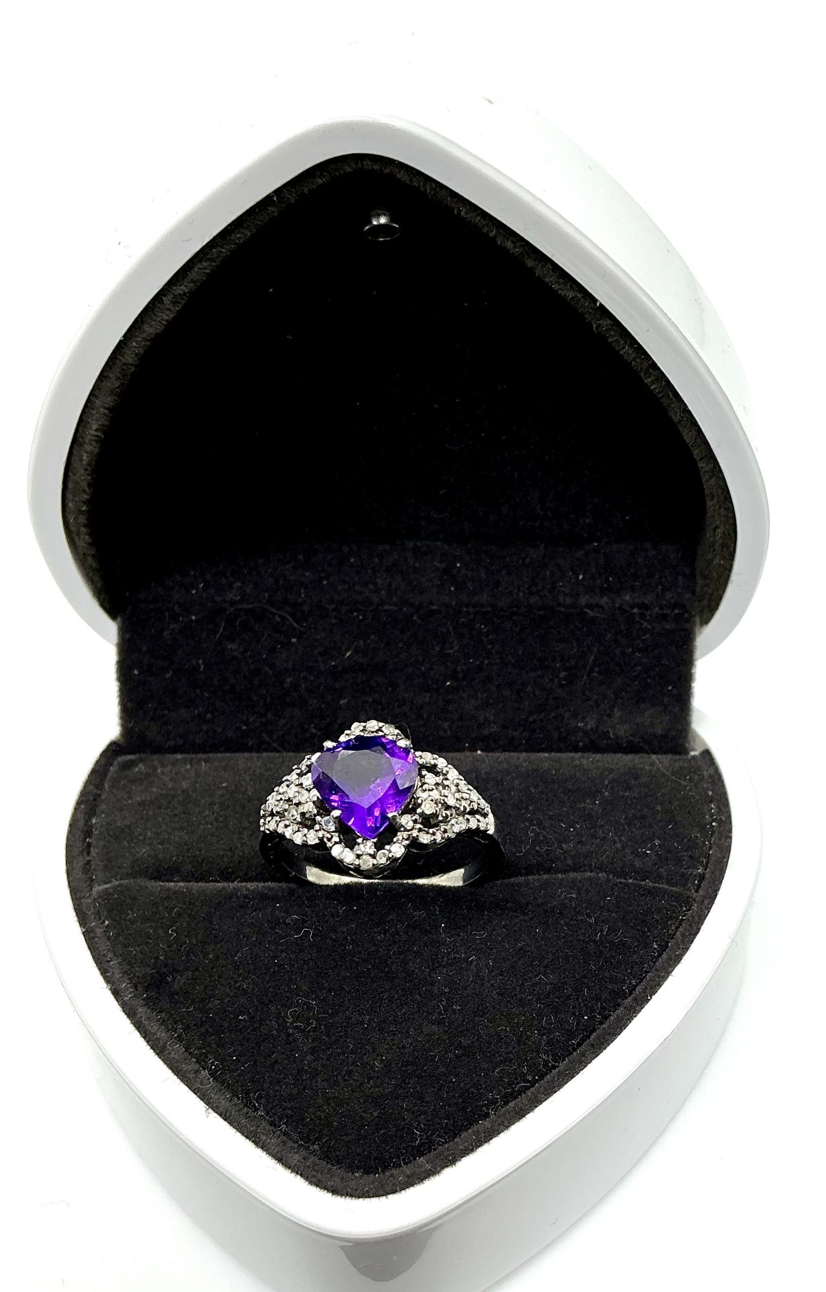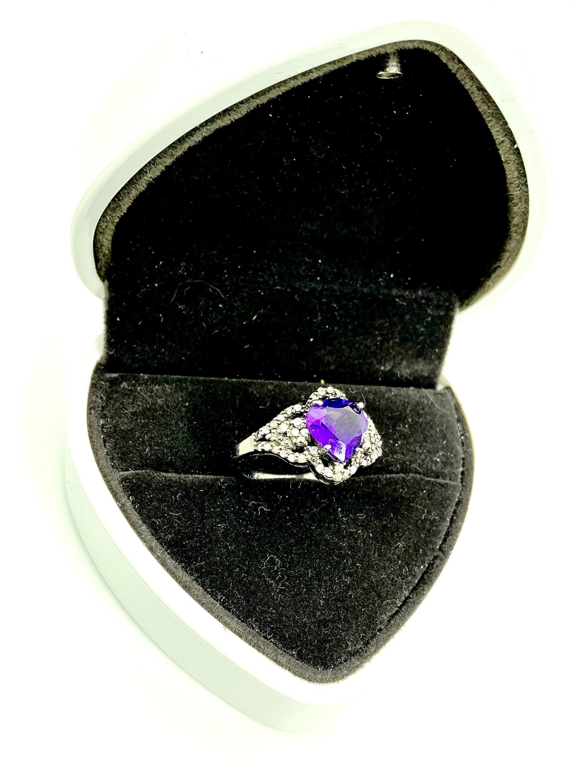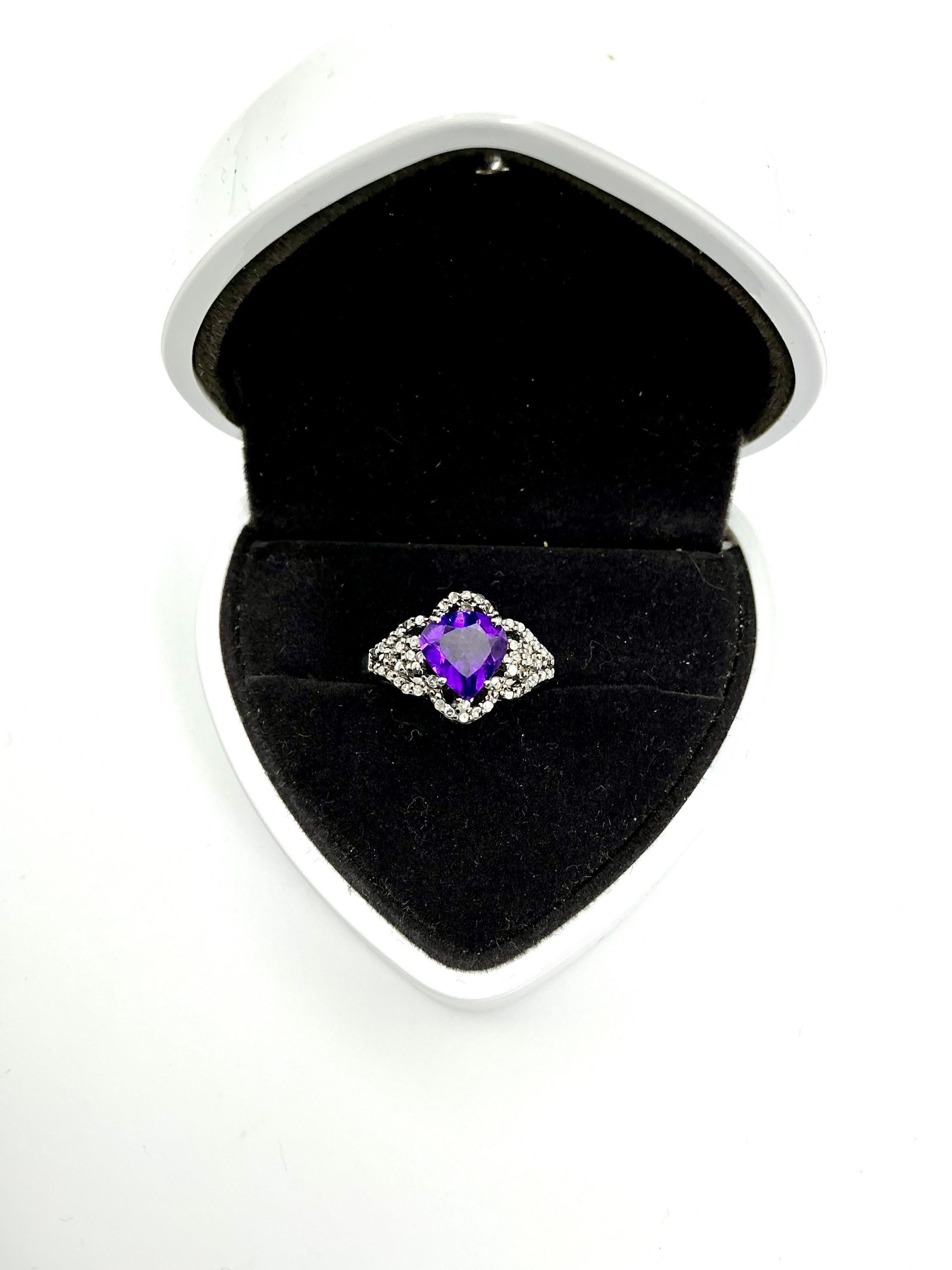 An elegant sterling silver ring featuring a rich heart-cut amethyst framed by shimmering diamonds. Size Q, 4.02g – a statement piece for any occasion.