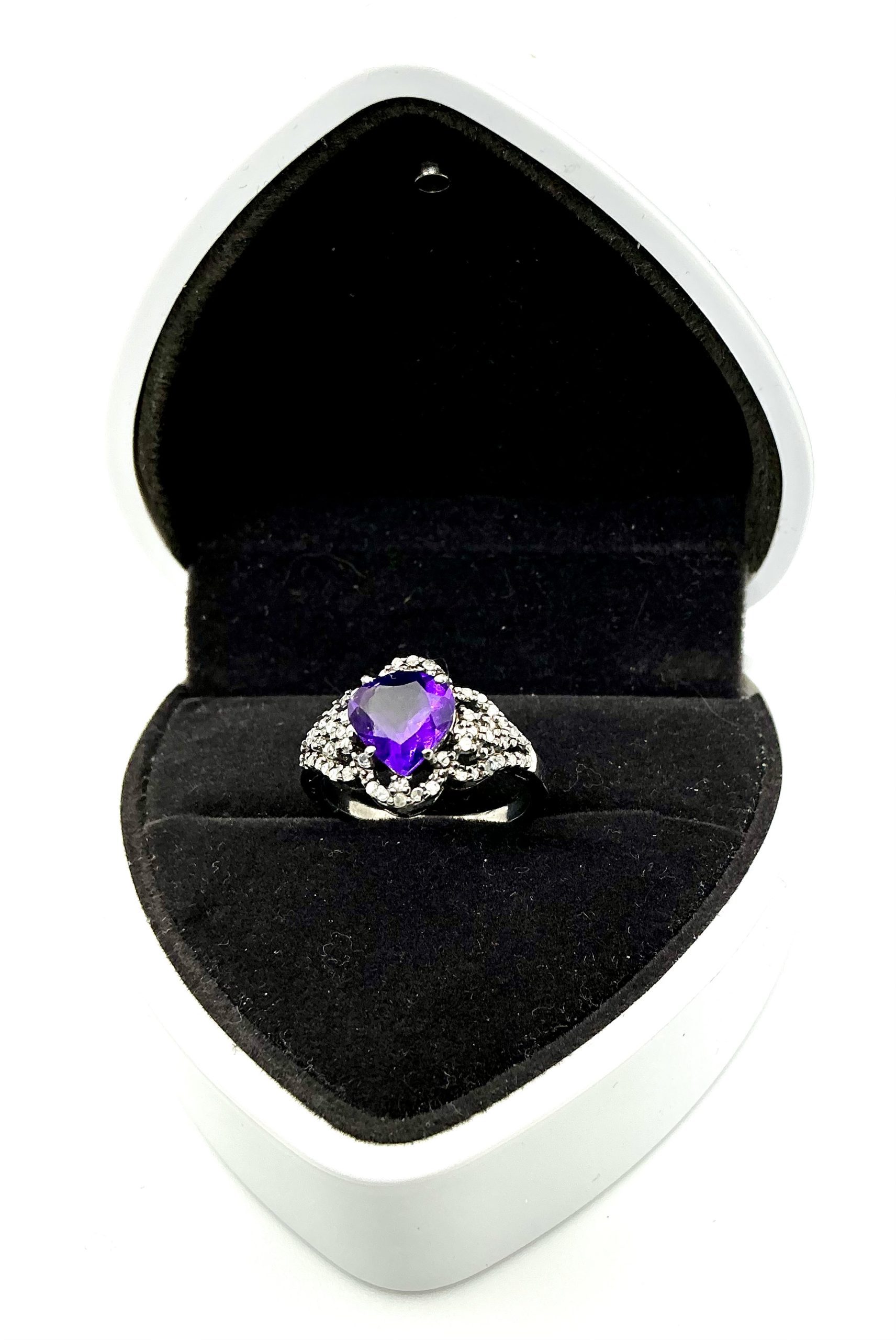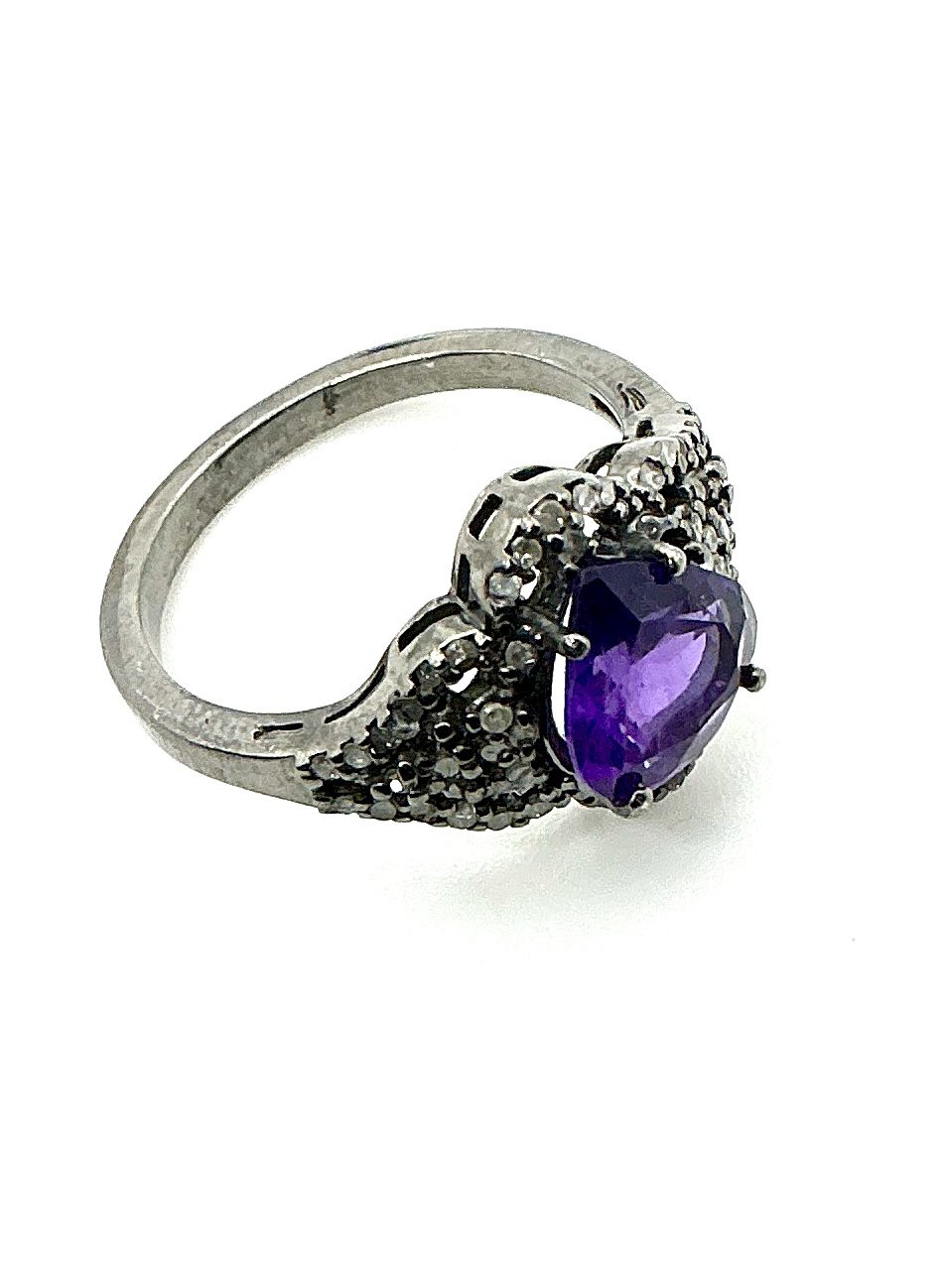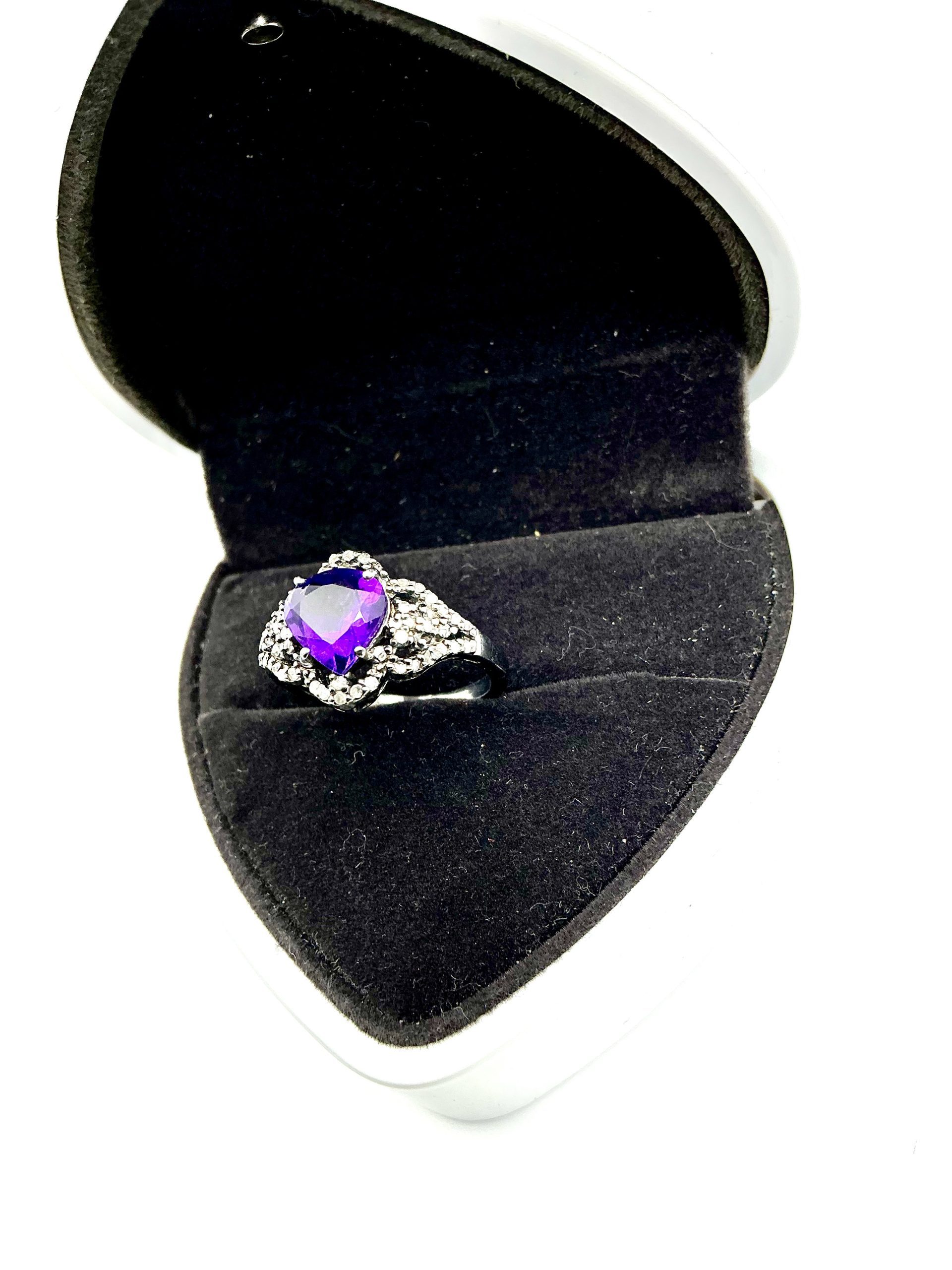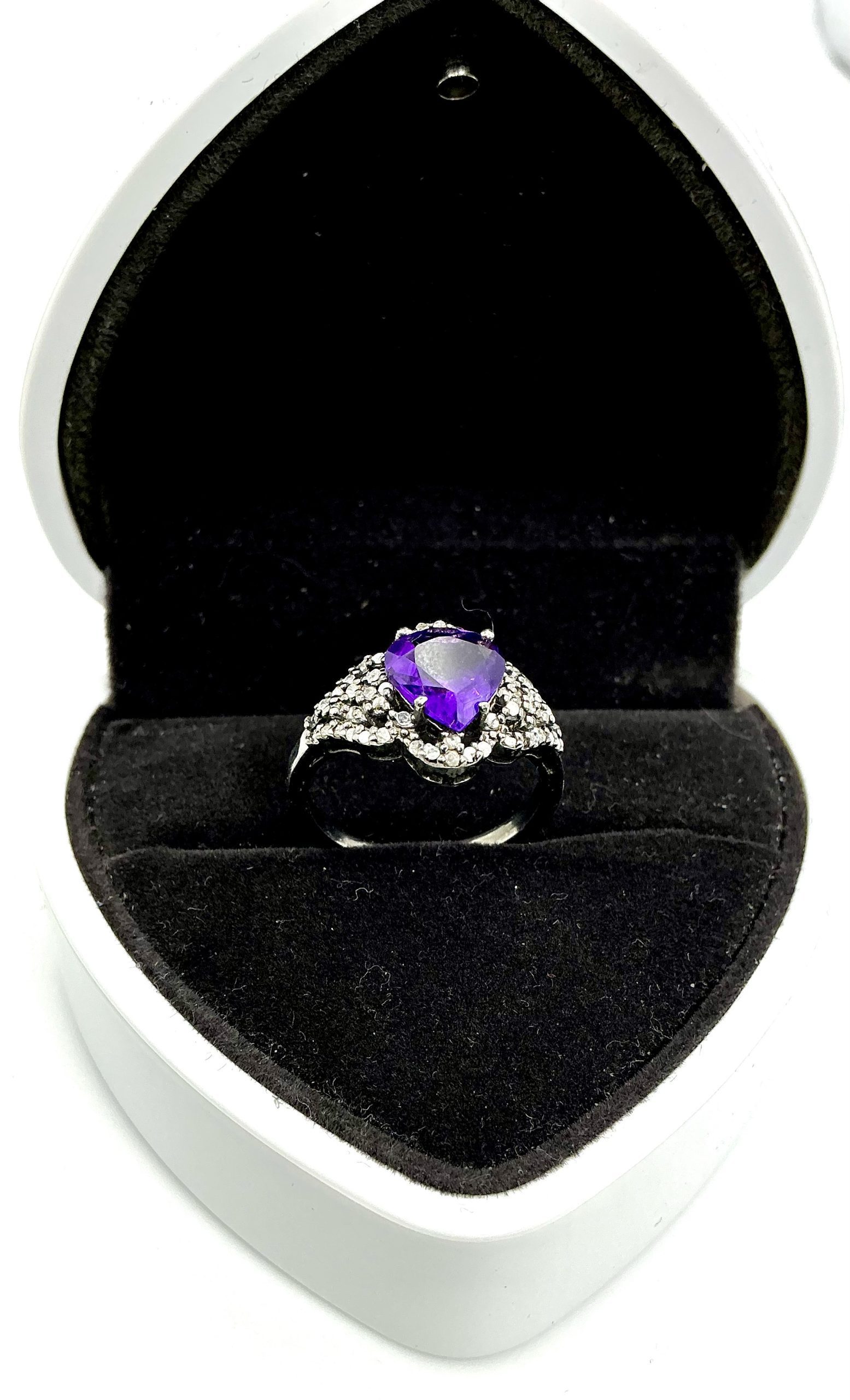 An elegant sterling silver ring featuring a rich heart-cut amethyst framed by shimmering diamonds. Size Q, 4.02g – a statement piece for any occasion.