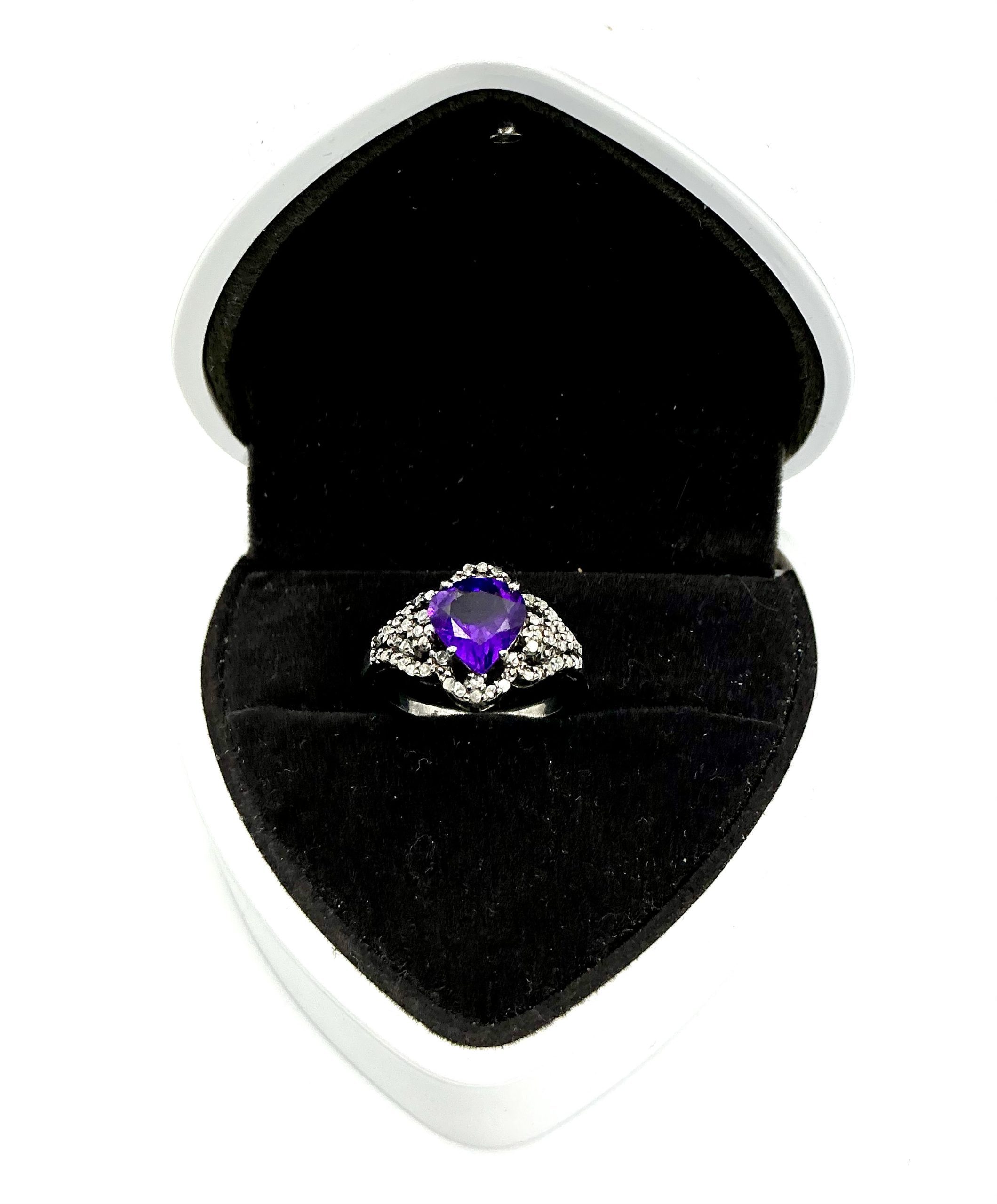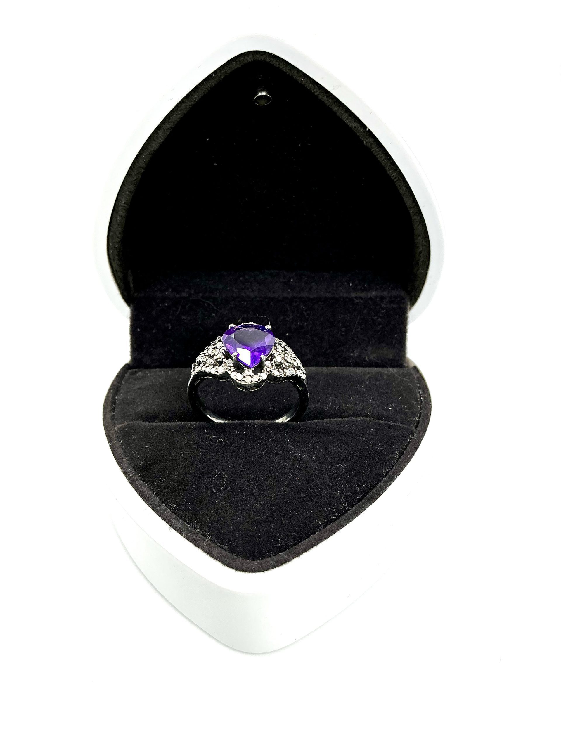 Expertly crafted from sterling silver, the centrepiece is a vivid purple, heart-cut amethyst, celebrated for its rich royal hue and associations with calm, balance, and love. Surrounding the amethyst is a glittering array of brilliant-cut diamonds, enhancing the gemstone’s natural beauty with a radiant halo effect.