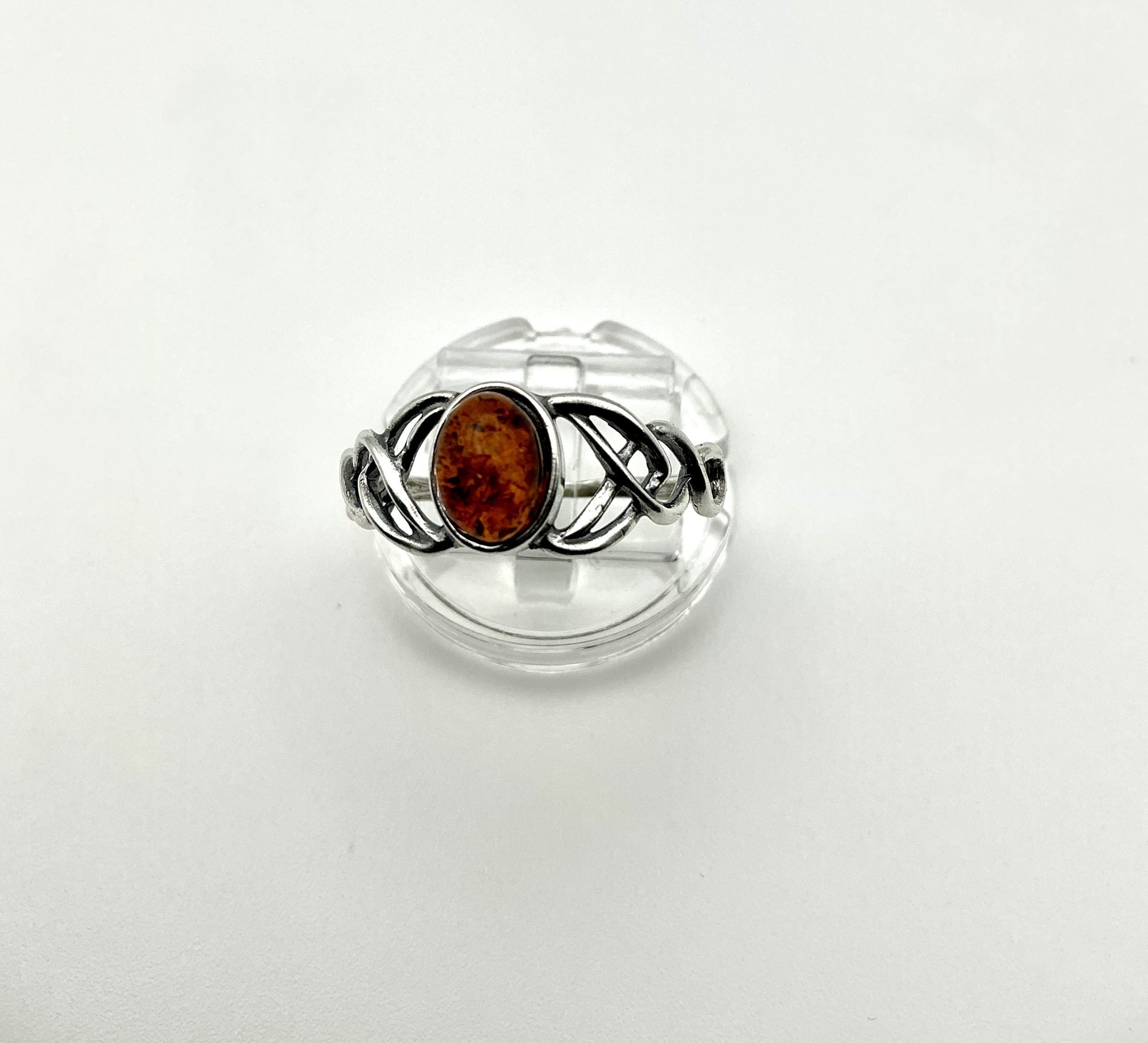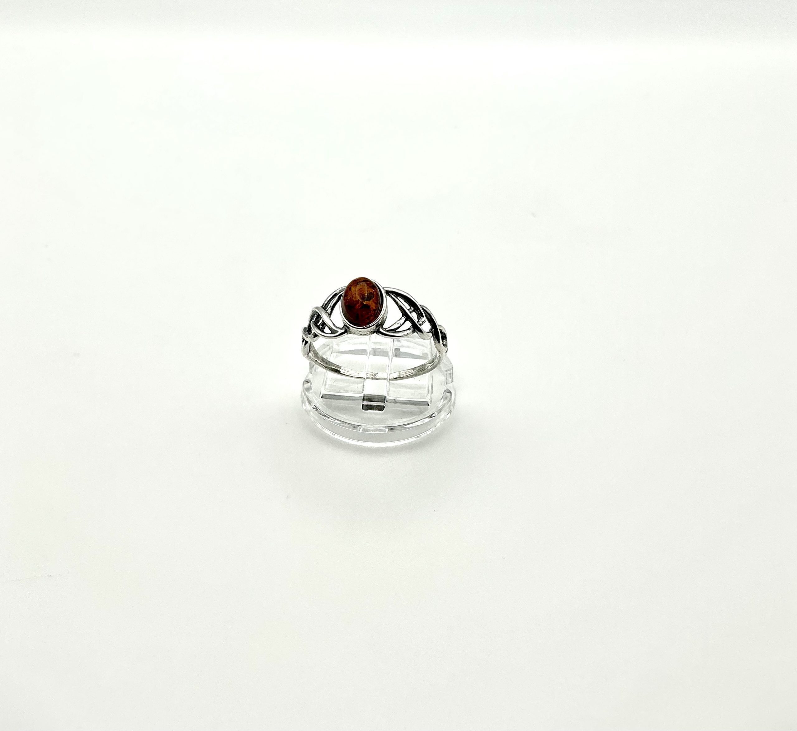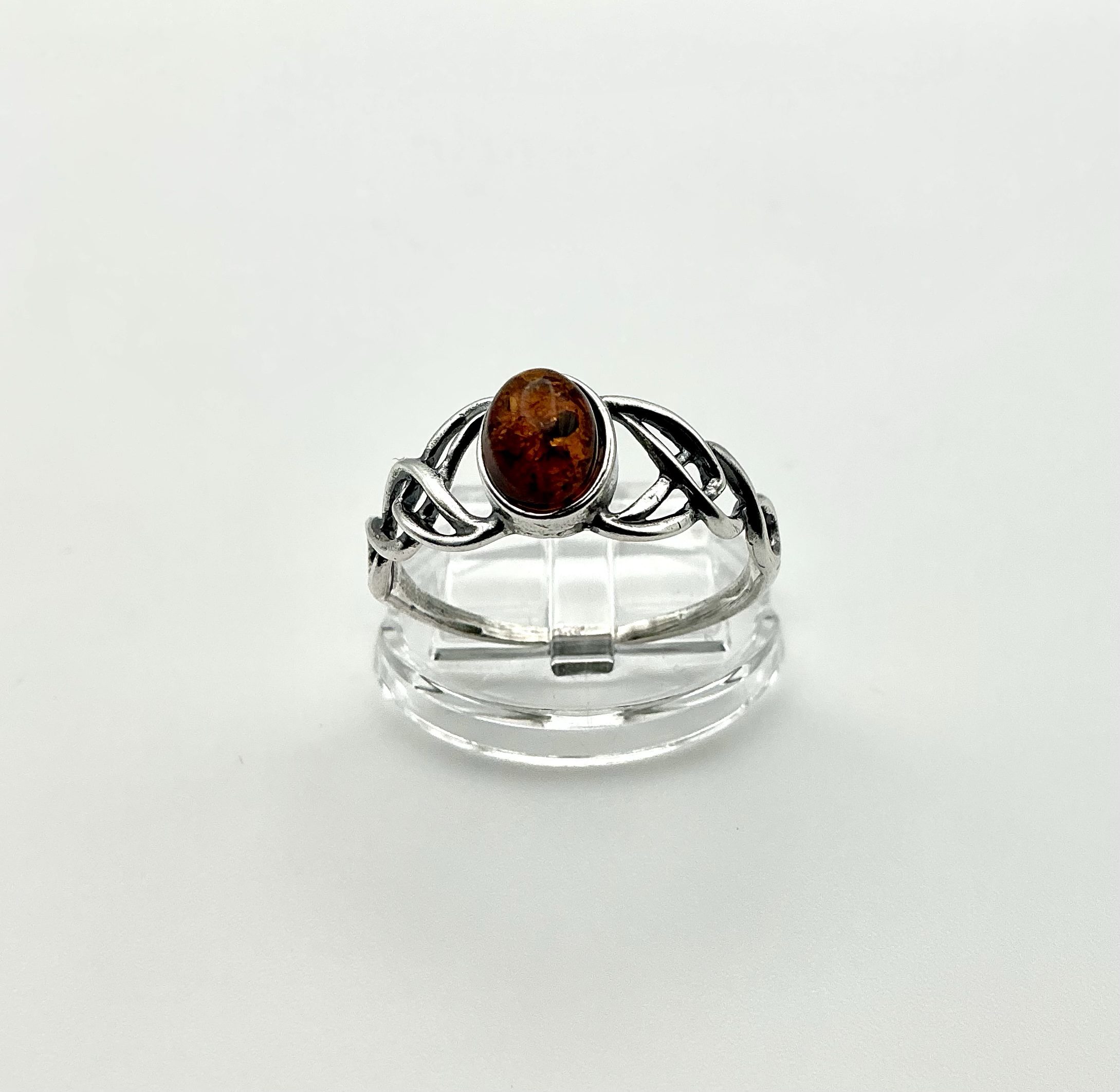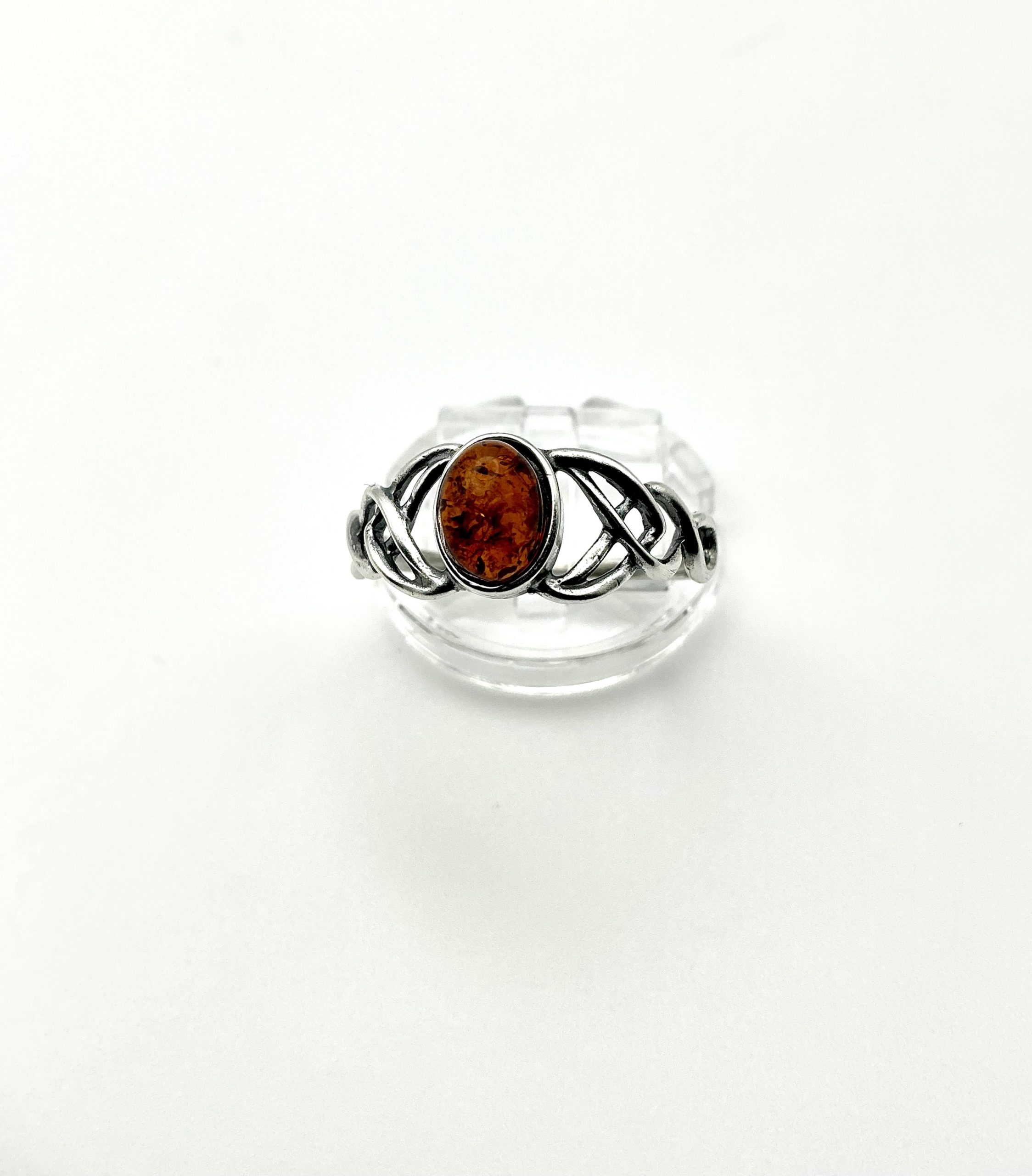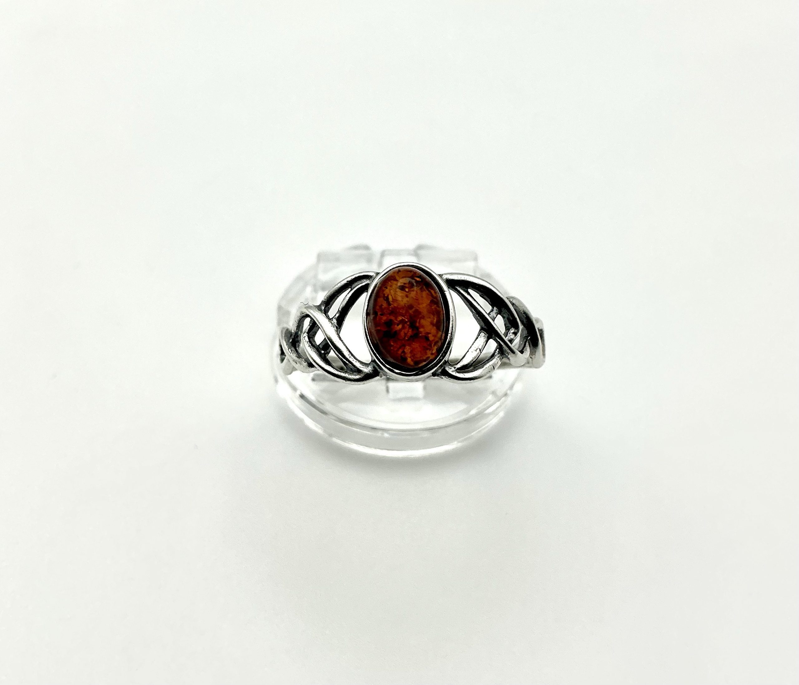 Sterling silver Celtic-style ring with oval Baltic amber. Intricate knotwork and warm, natural gemstone beauty.