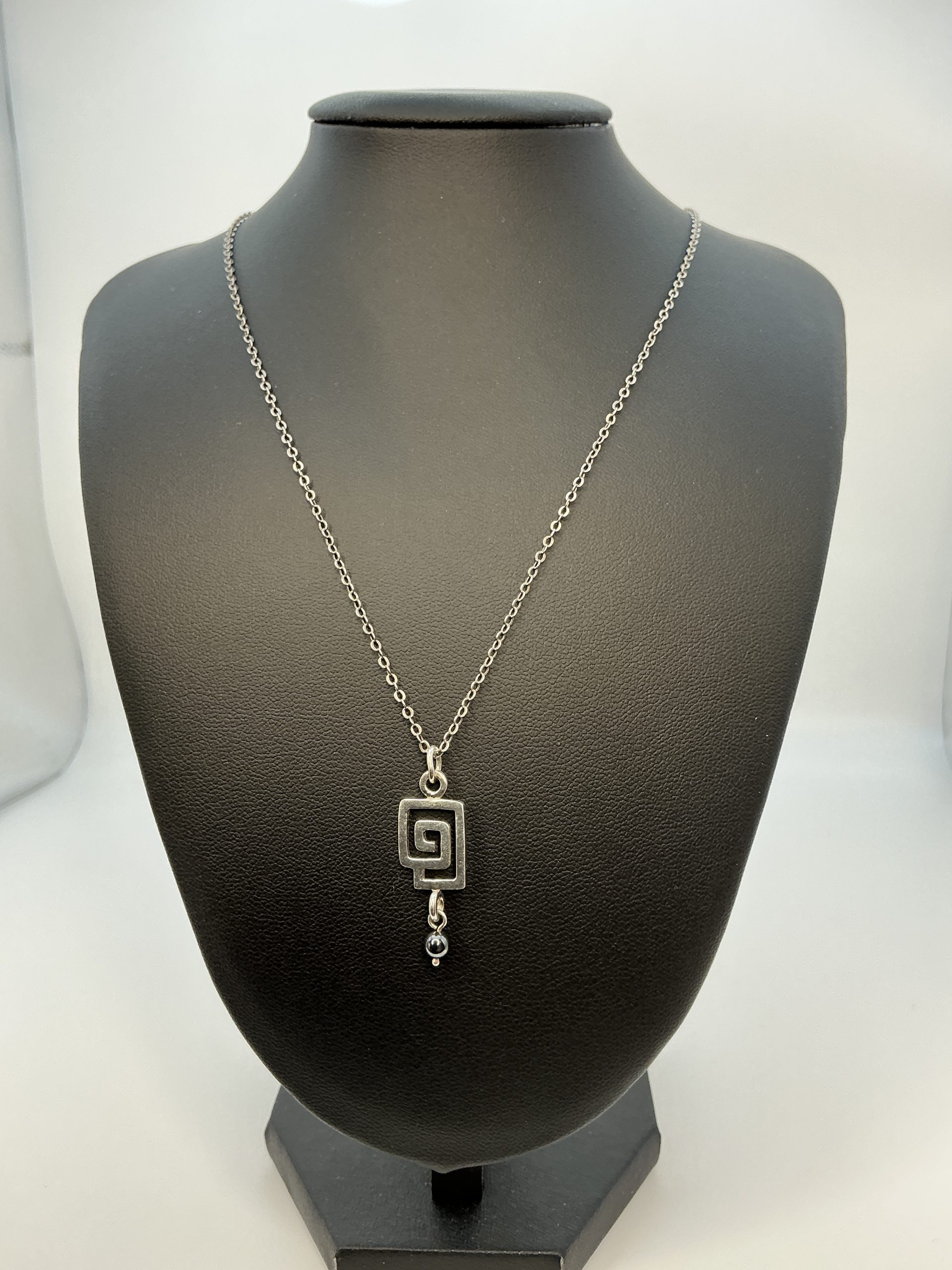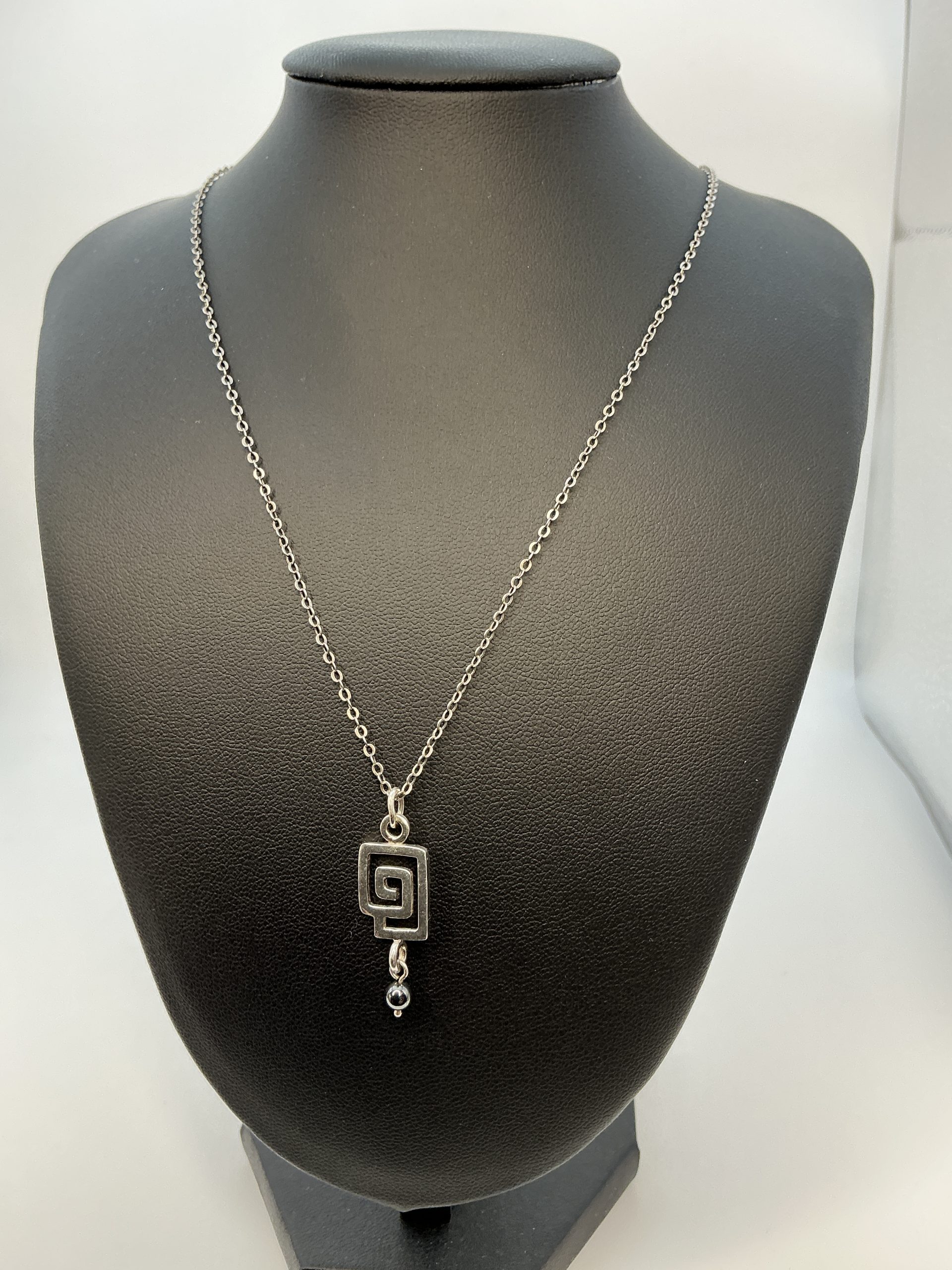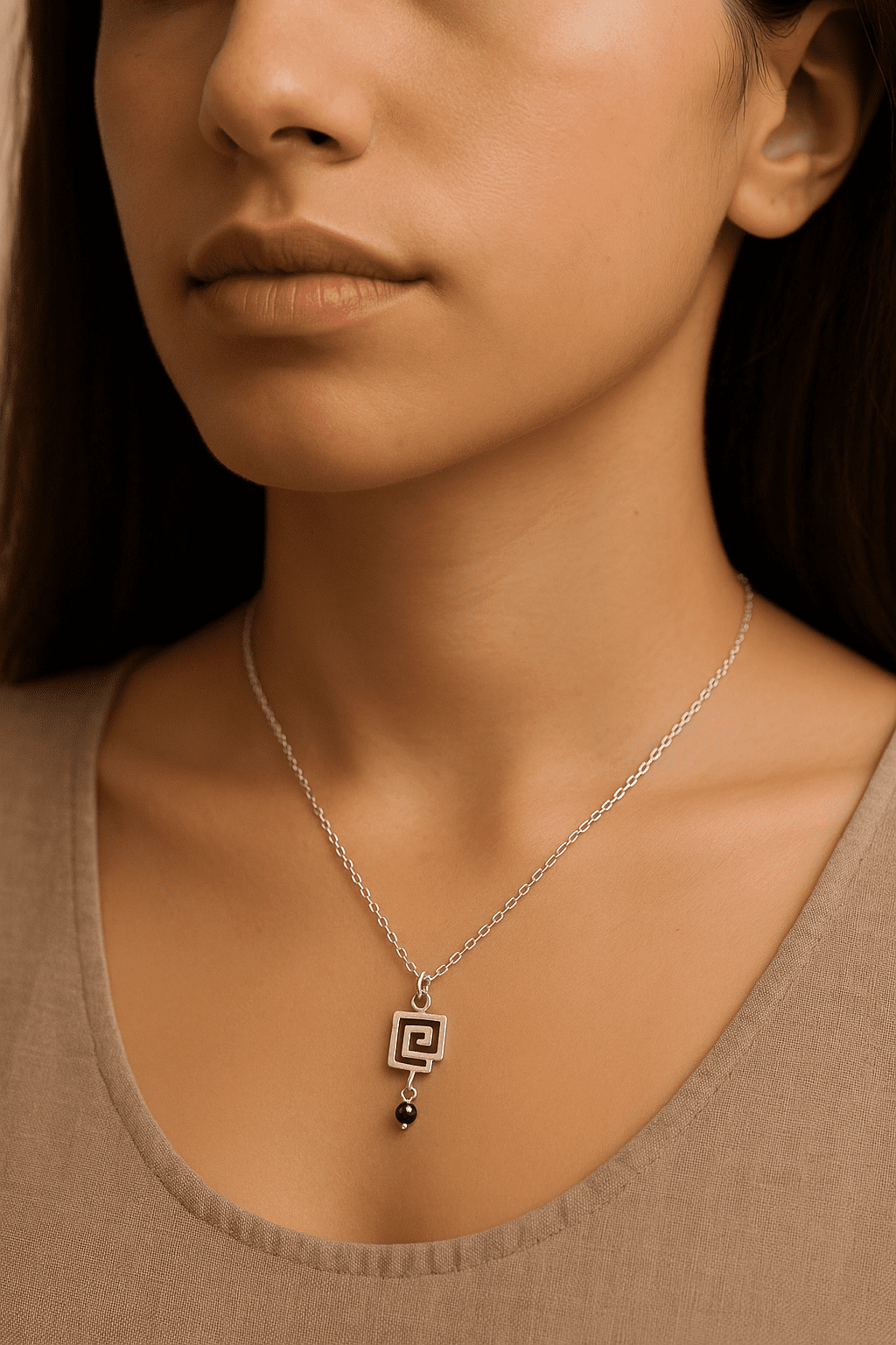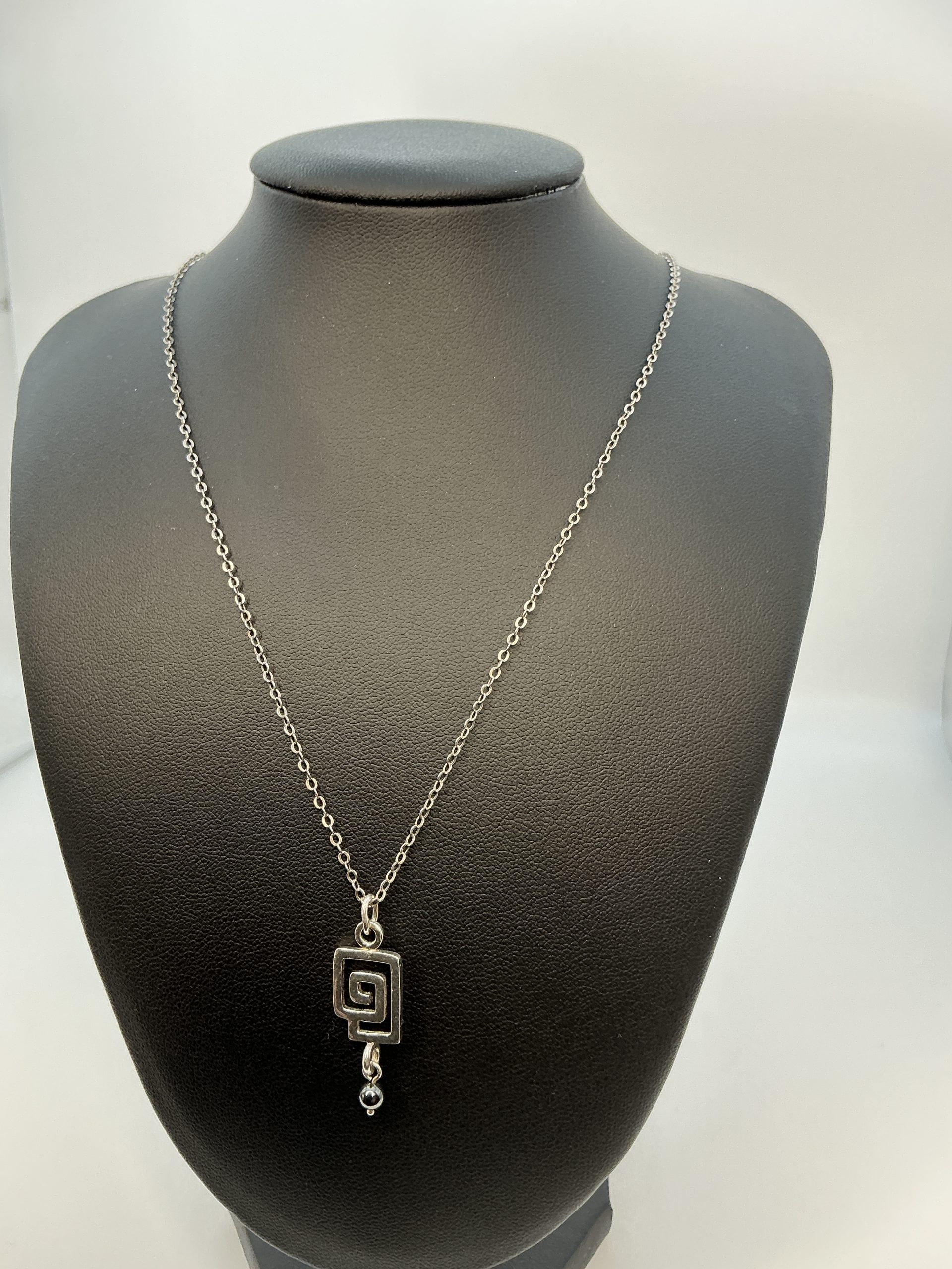 This chic sterling silver necklace offers a minimalist yet striking design. The rectangular spiral pendant symbolises creativity and flow, while the small black stone adds depth and contrast. Crafted from solid 925 sterling silver, it weighs 3.12g and comes with an 18.5″ fine link chain. A versatile piece, perfect for both casual styling and smart evening wear.