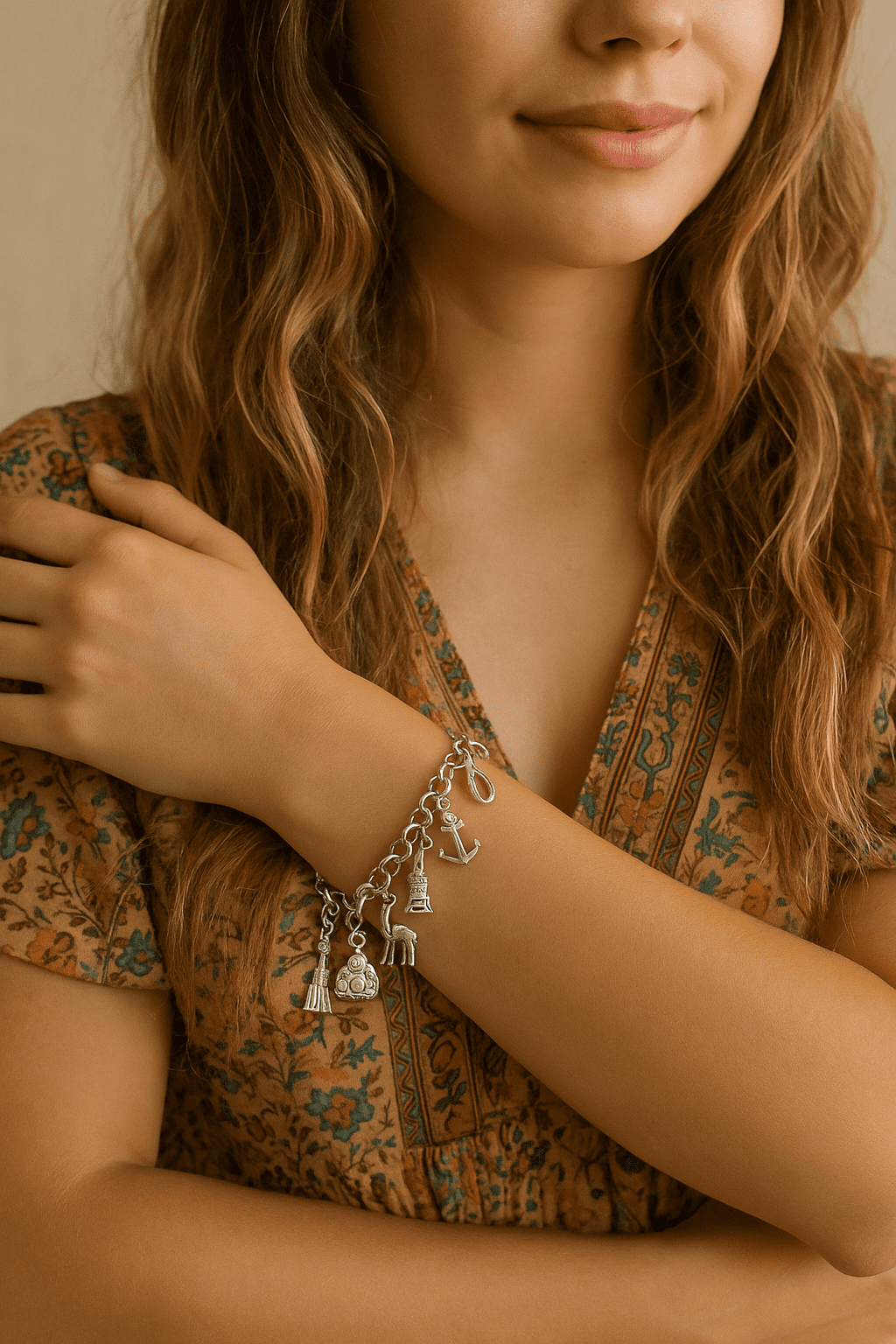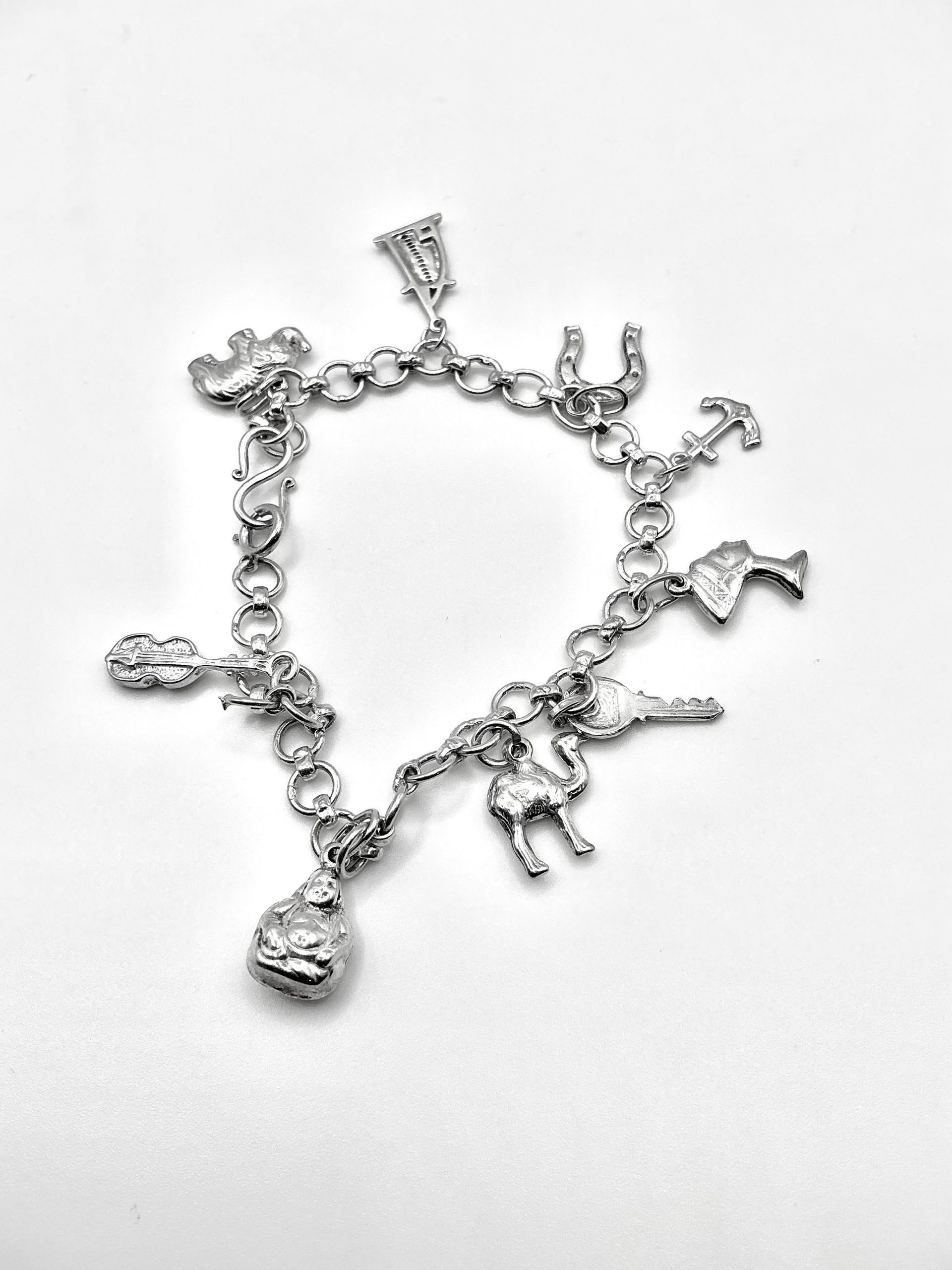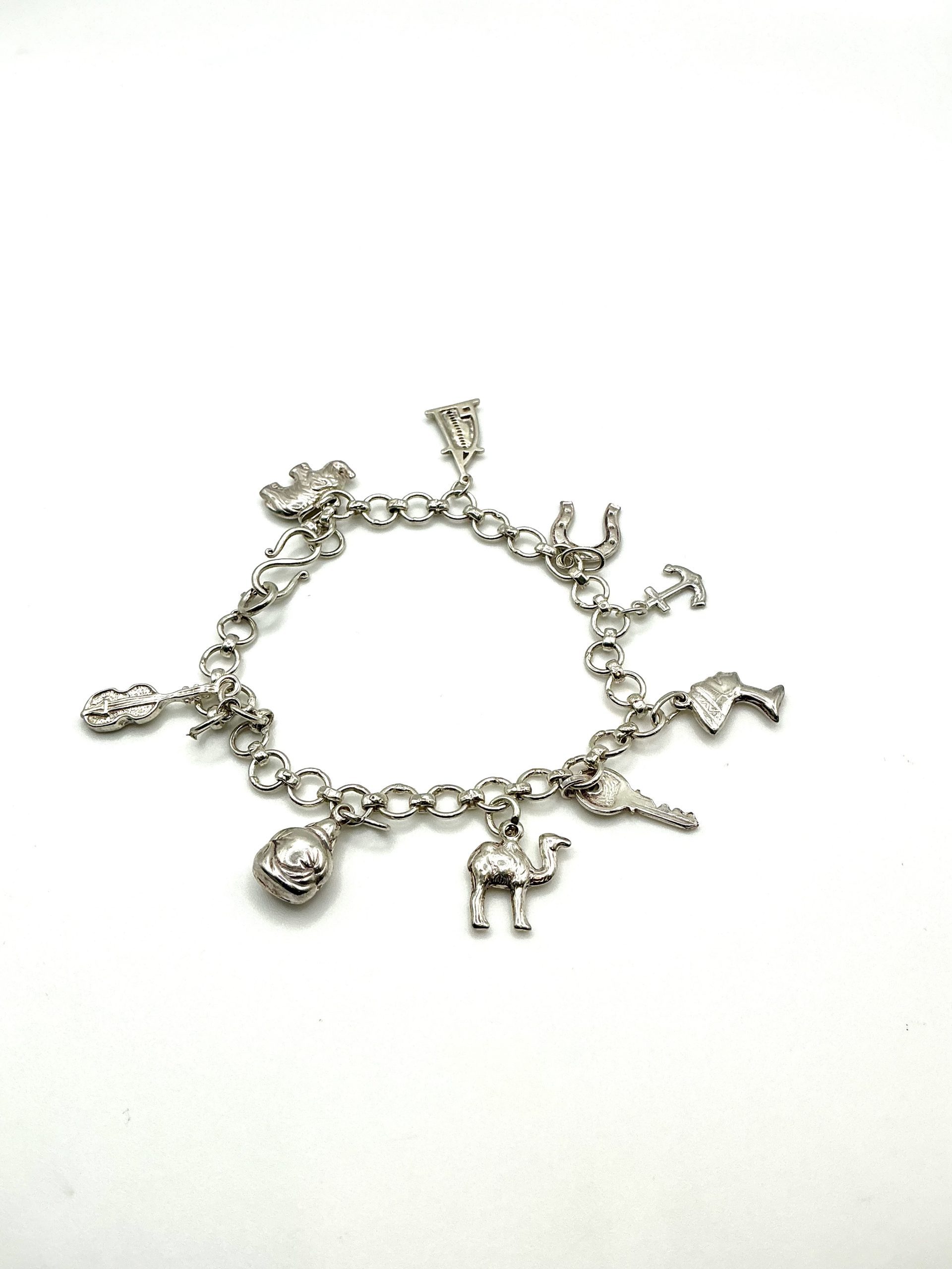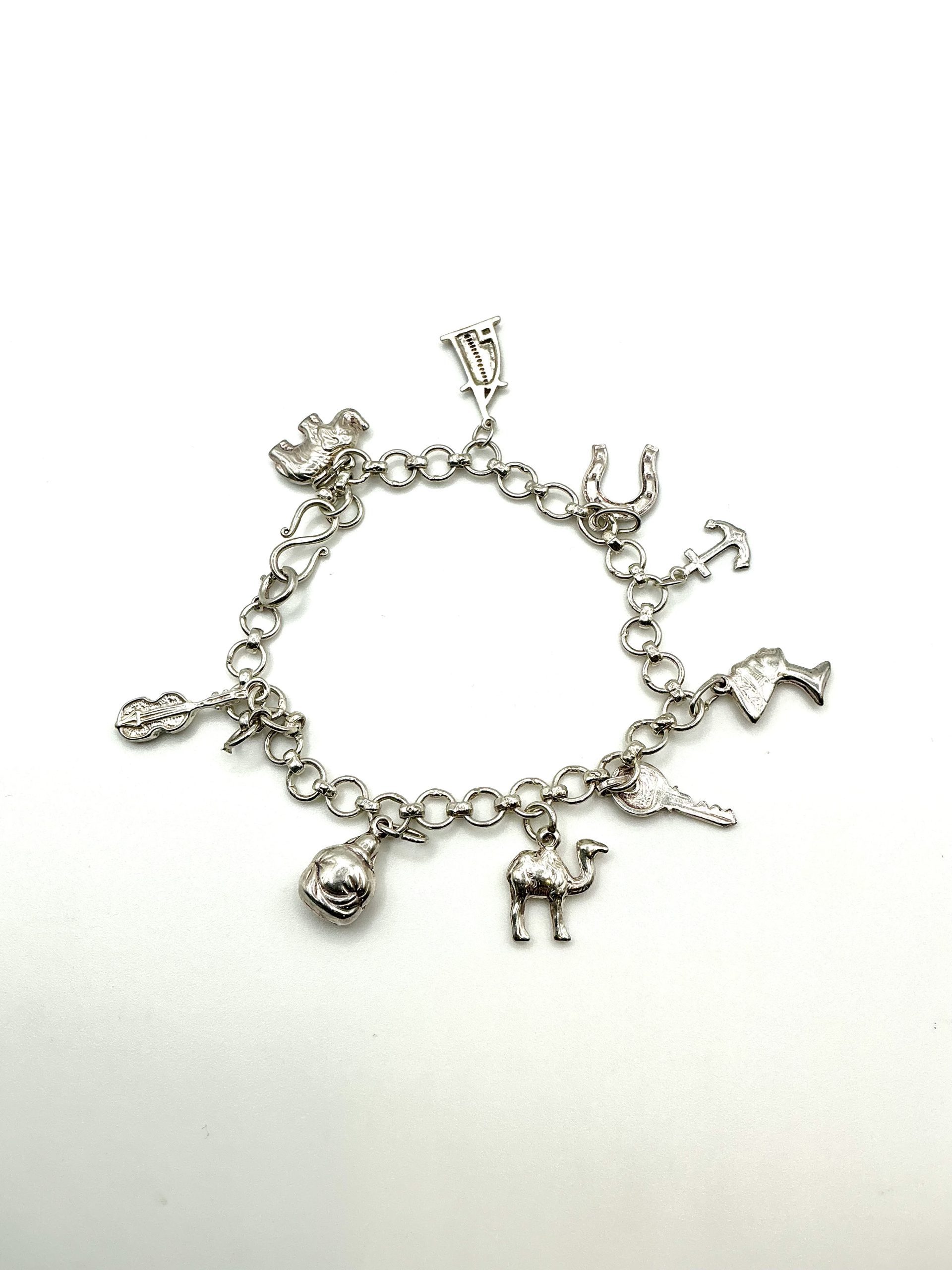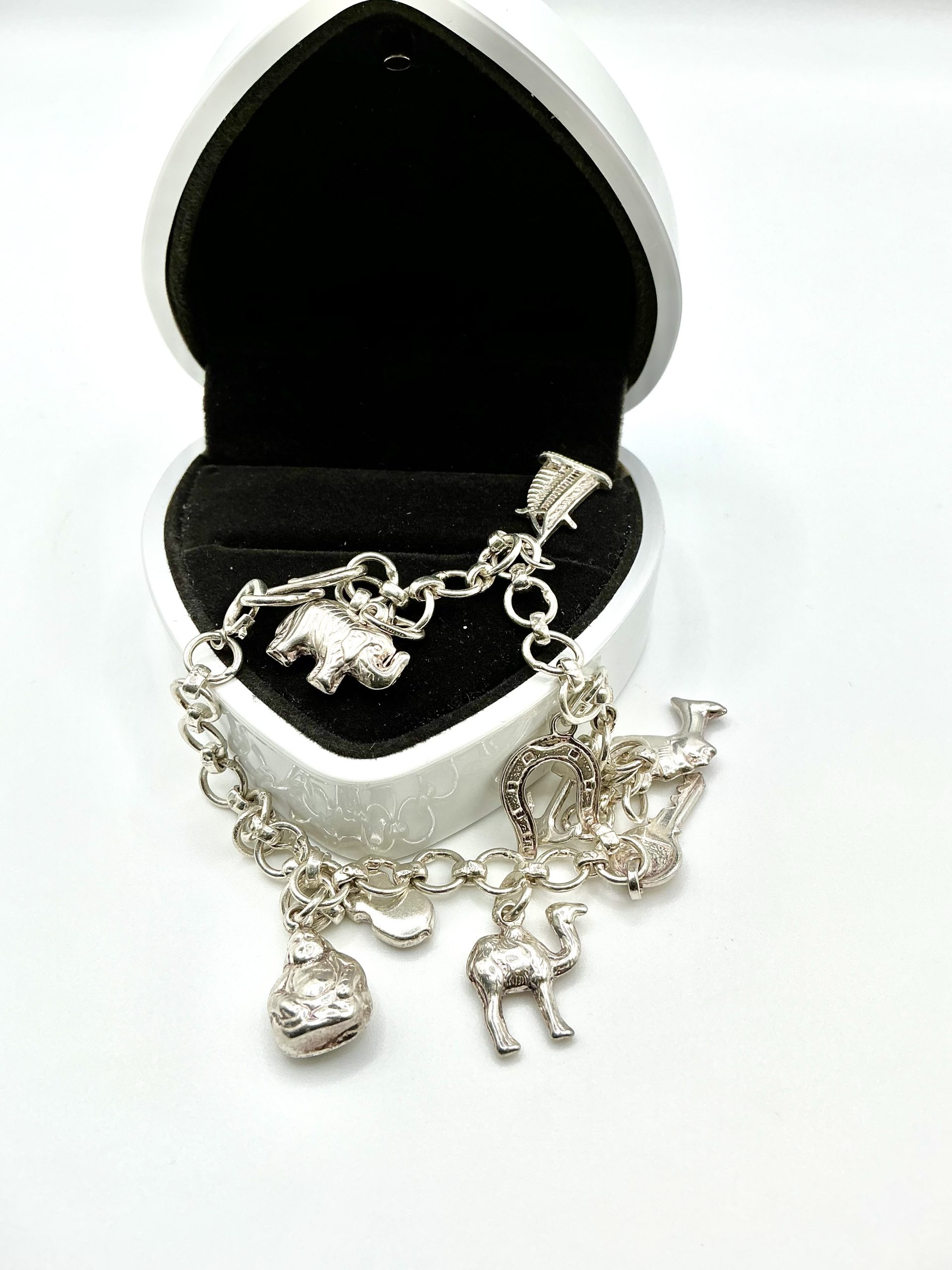 This exquisite sterling silver charm bracelet is a statement of style and sentiment. Weighing an impressive 20.7 grams, it showcases nine carefully crafted charms, each symbolising a special meaning—from protection and prosperity to ambition and creativity.