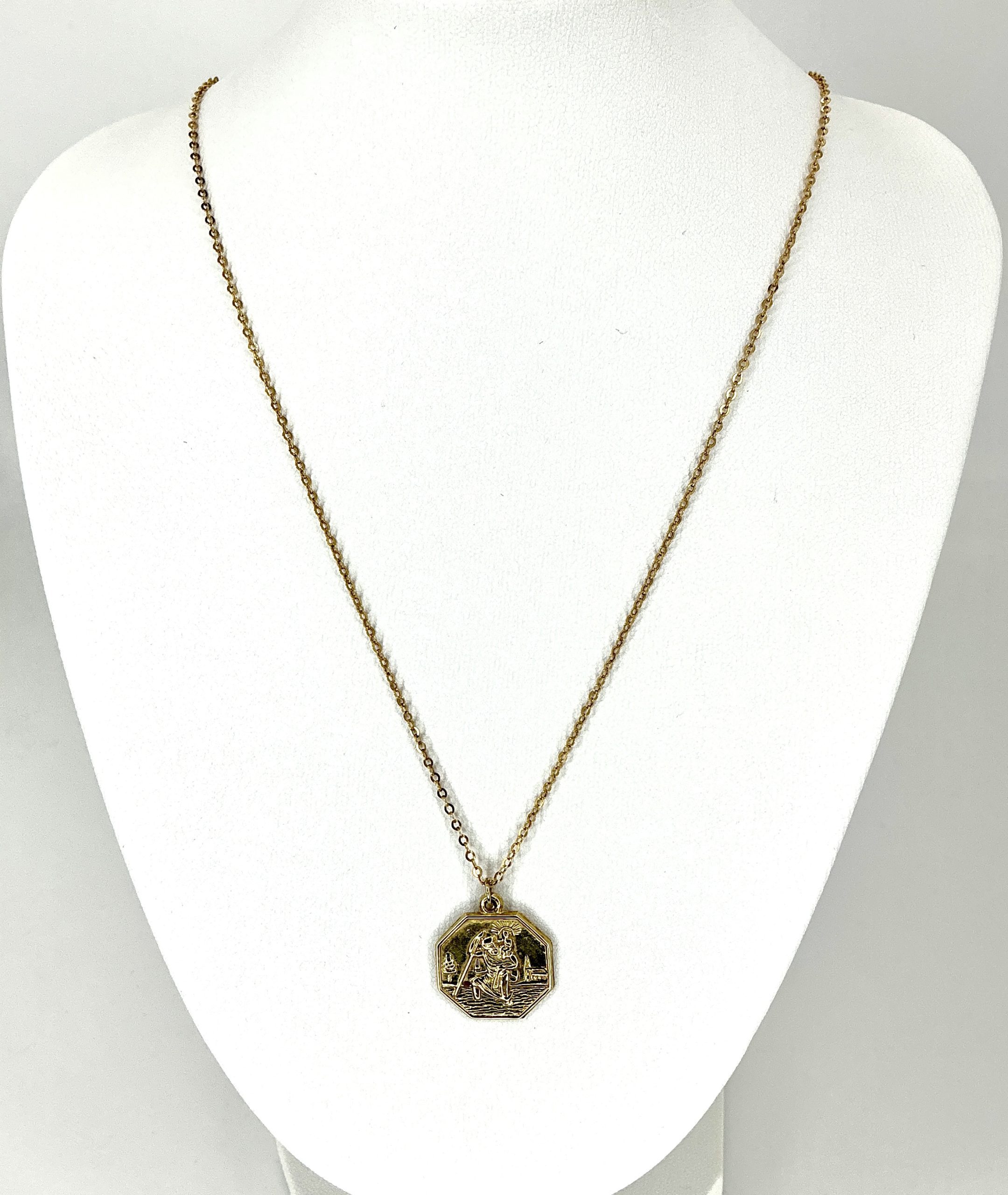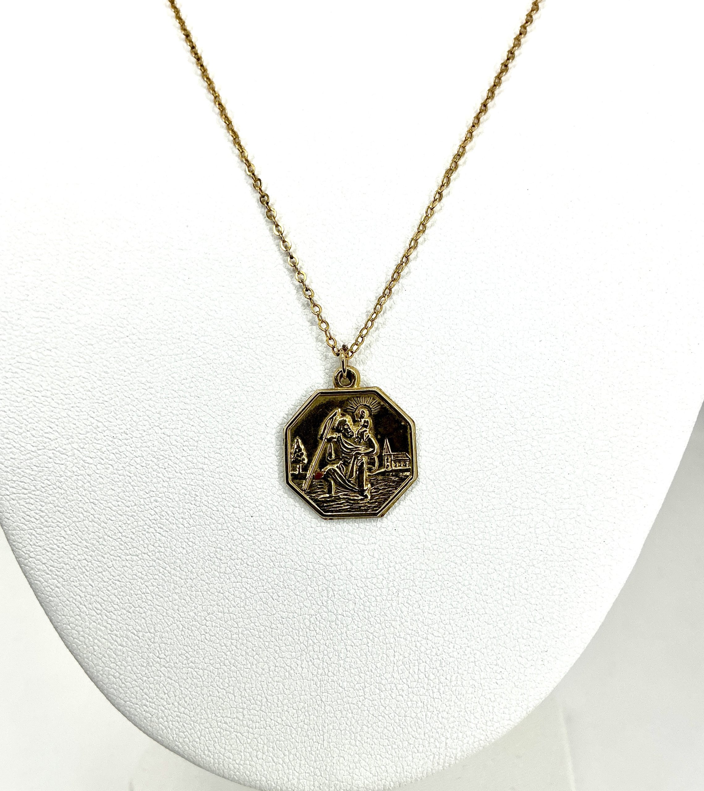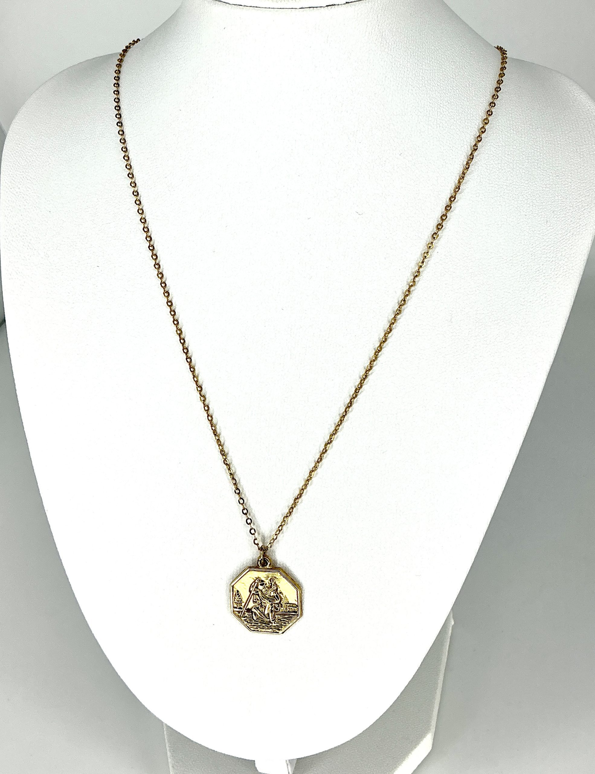 The octagonal design features refined detail and a classic vintage patina, evoking the warmth and durability of real gold. Suspended from a delicate but sturdy 16-inch 9ct gold chain, it sits comfortably at the collarbone for a subtle but meaningful presence.