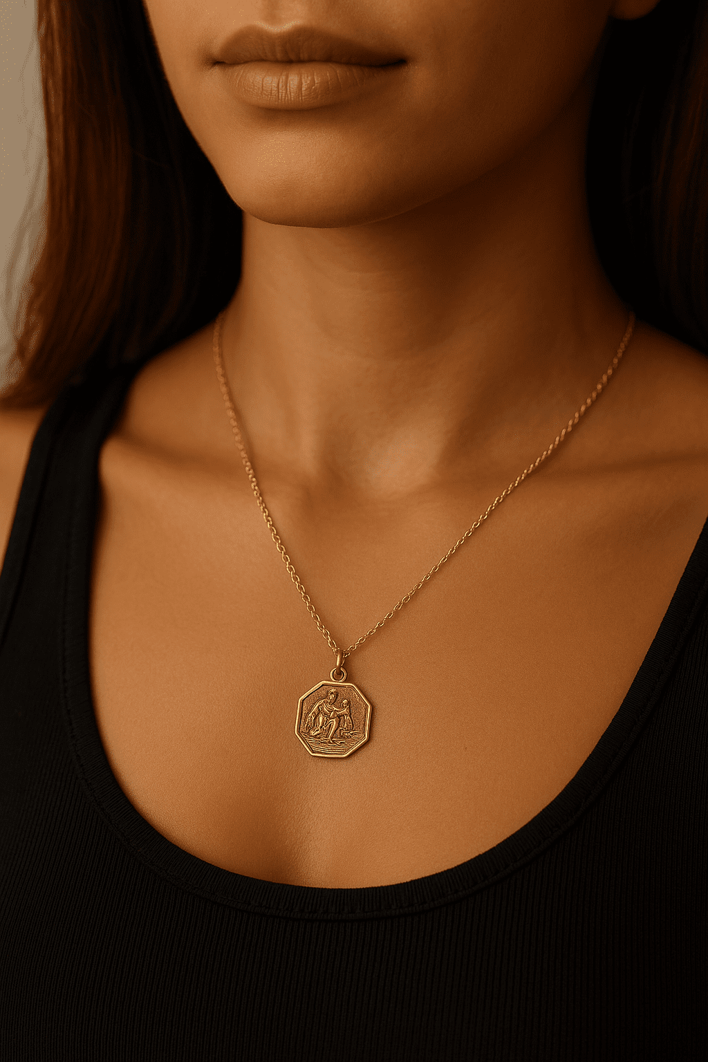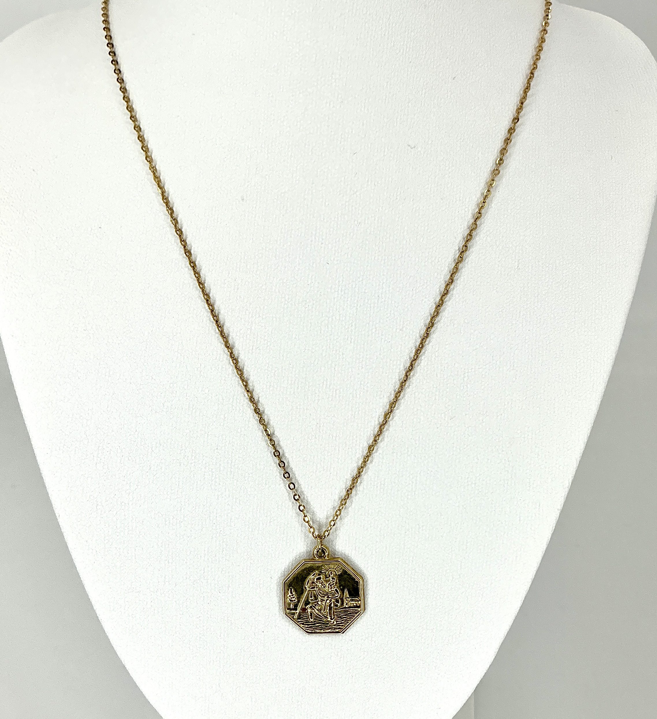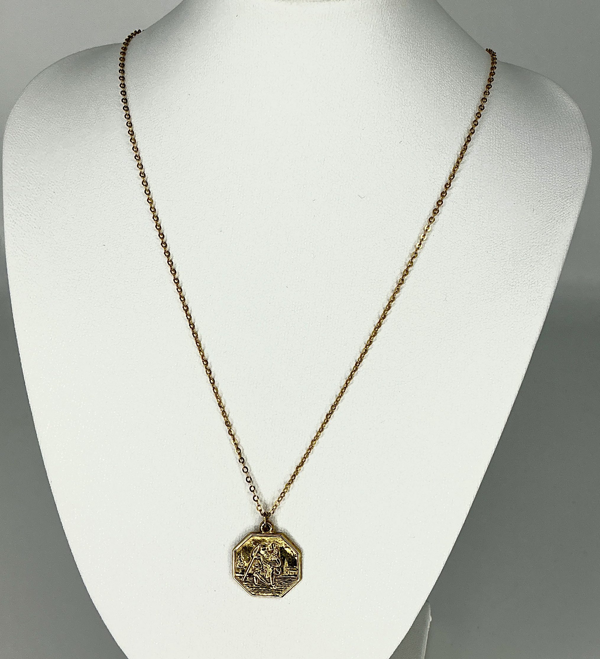 The octagonal design features refined detail and a classic vintage patina, evoking the warmth and durability of real gold. Suspended from a delicate but sturdy 16-inch 9ct gold chain, it sits comfortably at the collarbone for a subtle but meaningful presence.